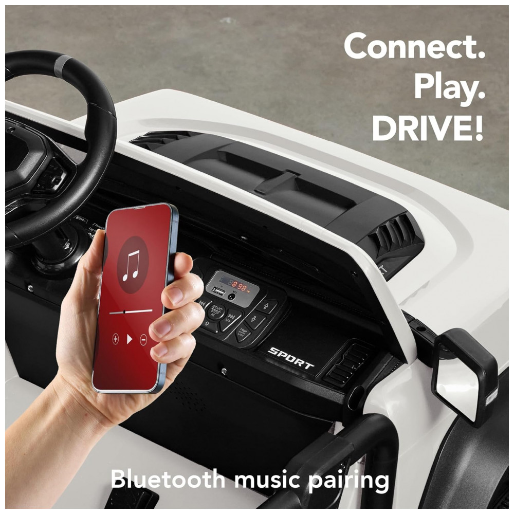 O carro possui sistema de cinto de segurança ajustável para crianças, rodas de plástico com sulcos que proporcionam ótima aderência e suspensão nas duas rodas para um passeio suave. As luzes LED funcionais aumentam a interação, enquanto o sistema de som Bluetooth permite que as crianças ouçam suas músicas favoritas enquanto se divertem.
