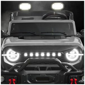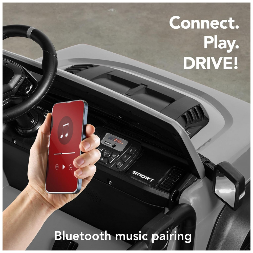 O carro possui sistema de cinto de segurança ajustável para crianças, rodas de plástico com sulcos que proporcionam ótima aderência e suspensão nas duas rodas para um passeio suave. As luzes LED funcionais aumentam a interação, enquanto o sistema de som Bluetooth permite que as crianças ouçam suas músicas favoritas enquanto se divertem.