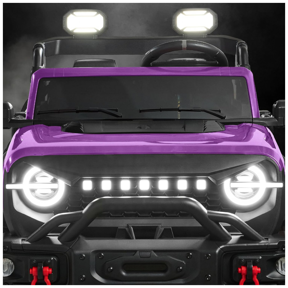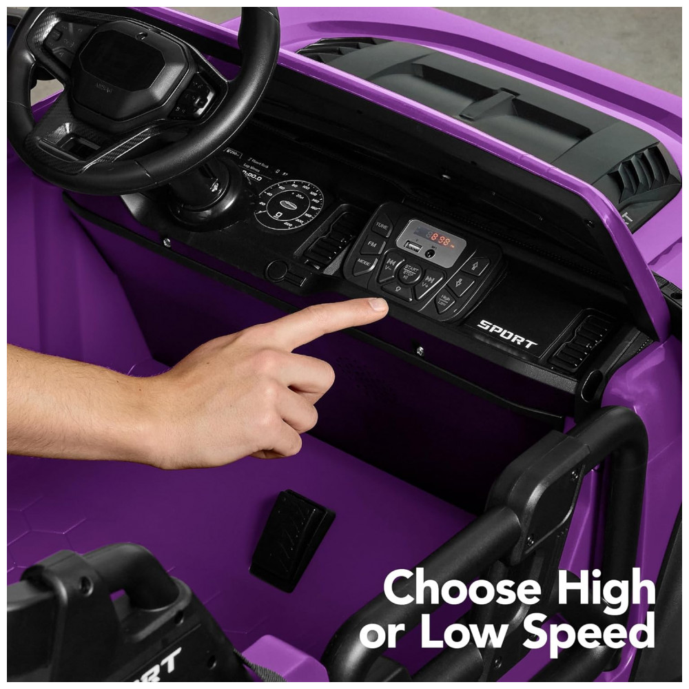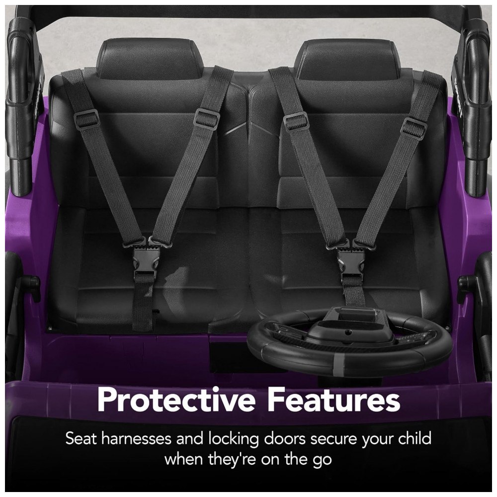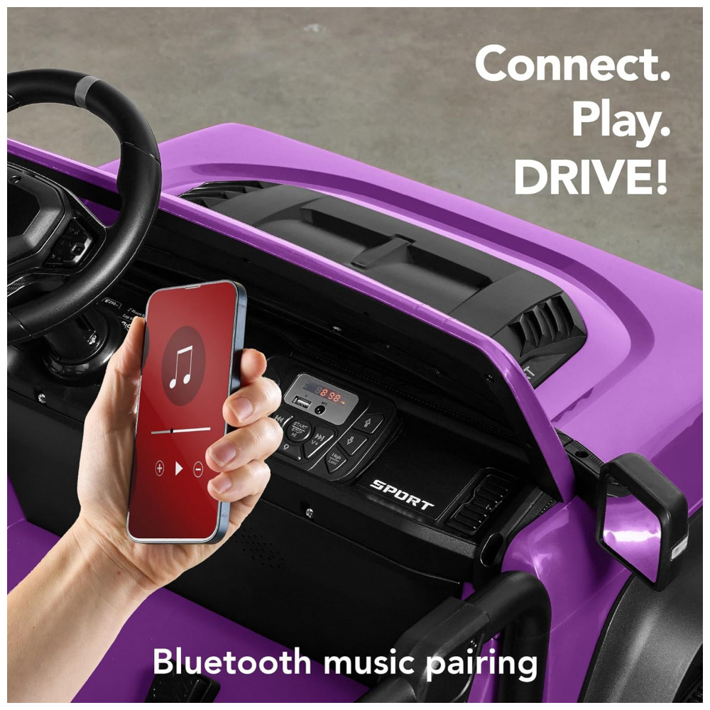 O carro possui sistema de cinto de segurança ajustável para crianças, rodas de plástico com sulcos que proporcionam ótima aderência e suspensão nas duas rodas para um passeio suave. As luzes LED funcionais aumentam a interação, enquanto o sistema de som Bluetooth permite que as crianças ouçam suas músicas favoritas enquanto se divertem.