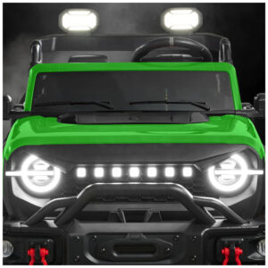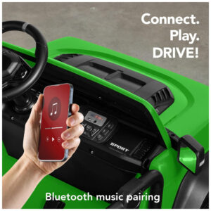 O carro possui sistema de cinto de segurança ajustável para crianças, rodas de plástico com sulcos que proporcionam ótima aderência e suspensão nas duas rodas para um passeio suave. As luzes LED funcionais aumentam a interação, enquanto o sistema de som Bluetooth permite que as crianças ouçam suas músicas favoritas enquanto se divertem.