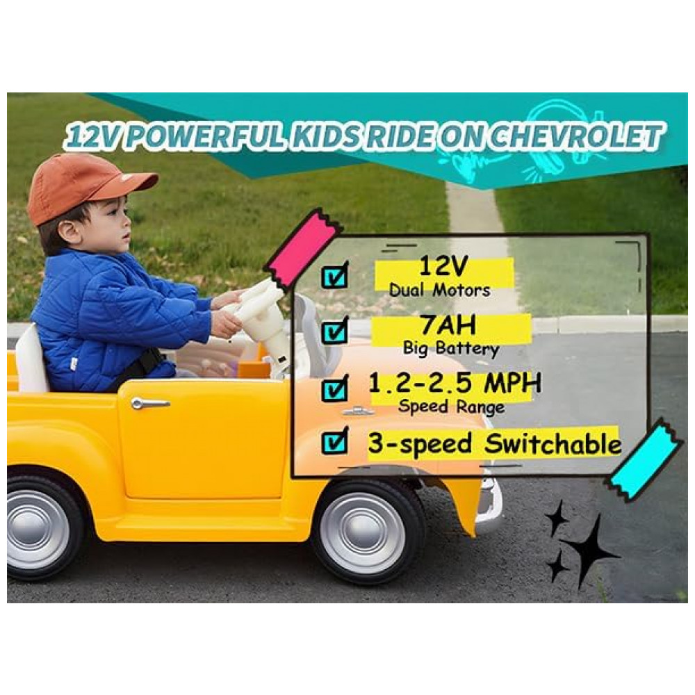O carrinho elétrico licenciado Chevrolet 3100 Pickup 12V da Joywhale é equipado com dois motores de 12V e bateria recarregável de 7Ah, possibilitando velocidades entre 1.2 e 2.5 mph conforme controle remoto com 3 opções de velocidade. Recomendado para crianças de 3 a 6 anos, oferece segurança com cinto ajustável, portas traváveis, pneus em PP antiderrapante e suspensão por molas para maior conforto.