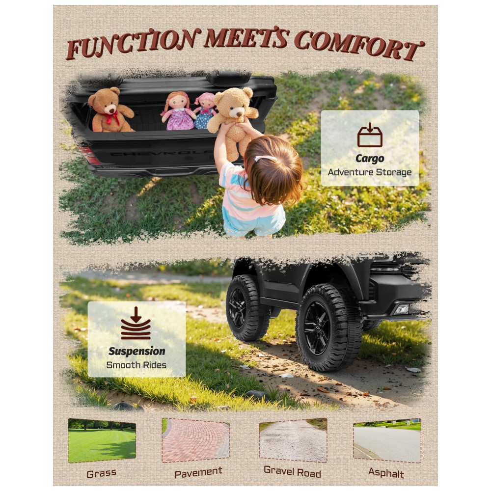 Ideal para presentear em aniversários, Natal e datas especiais, este Chevrolet Silverado 24V inspira momentos inesquecíveis em família, estimulando a imaginação, o companheirismo e a alegria das crianças. Sempre supervisione durante o uso, mantenha o cinto ajustado e utilize em superfícies planas e estáveis.