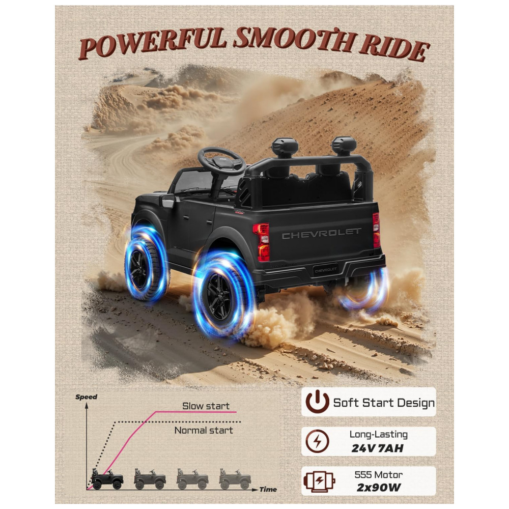 Carro Elétrico Infantil Chevrolet Silverado 24V Preto 2 Lugares com Controle Remoto Bluetooth Luzes LED e Cinto de Segurança