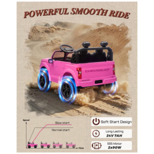 O modelo acomoda dois passageiros em assentos largos de 51 cm, permitindo que irmãos ou amigos compartilhem aventuras juntos. Equipado com bateria de 24V e motores duplos, o carro elétrico proporciona maior tempo de uso, melhor desempenho e velocidade superior em relação aos modelos convencionais de 12V.