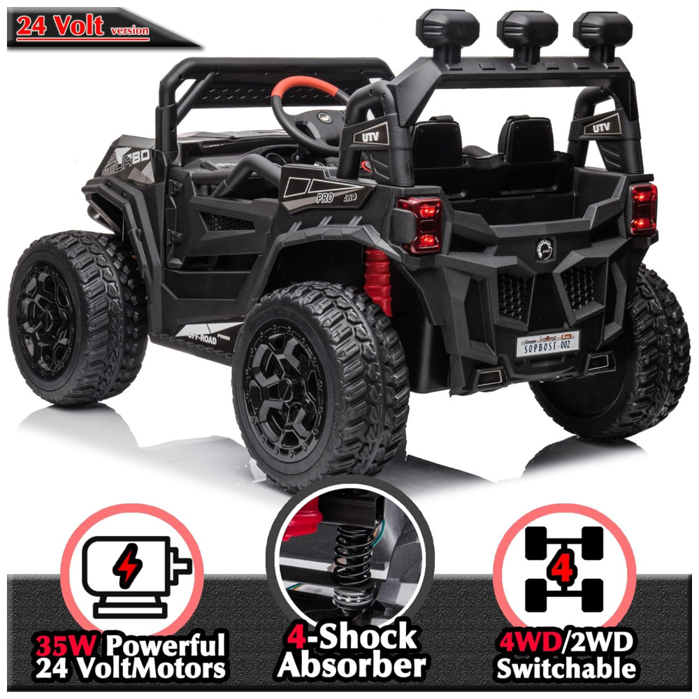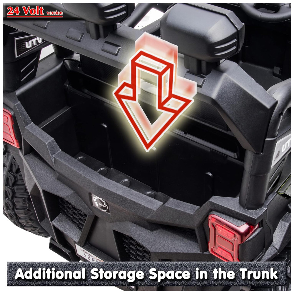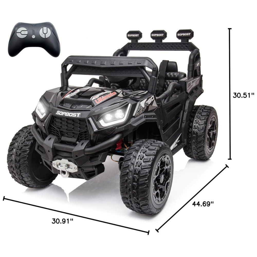 Durabilidade e Capacidade: Fabricado com um corpo de plástico PP durável e certificado pela ASTM F963, o UTV suporta uma carga máxima de 49,89 kg e alcança uma velocidade máxima de até 8 km/h. É um presente ideal para aniversários, Dia de Ação de Graças, Natal, Ano Novo e outras ocasiões especiais.