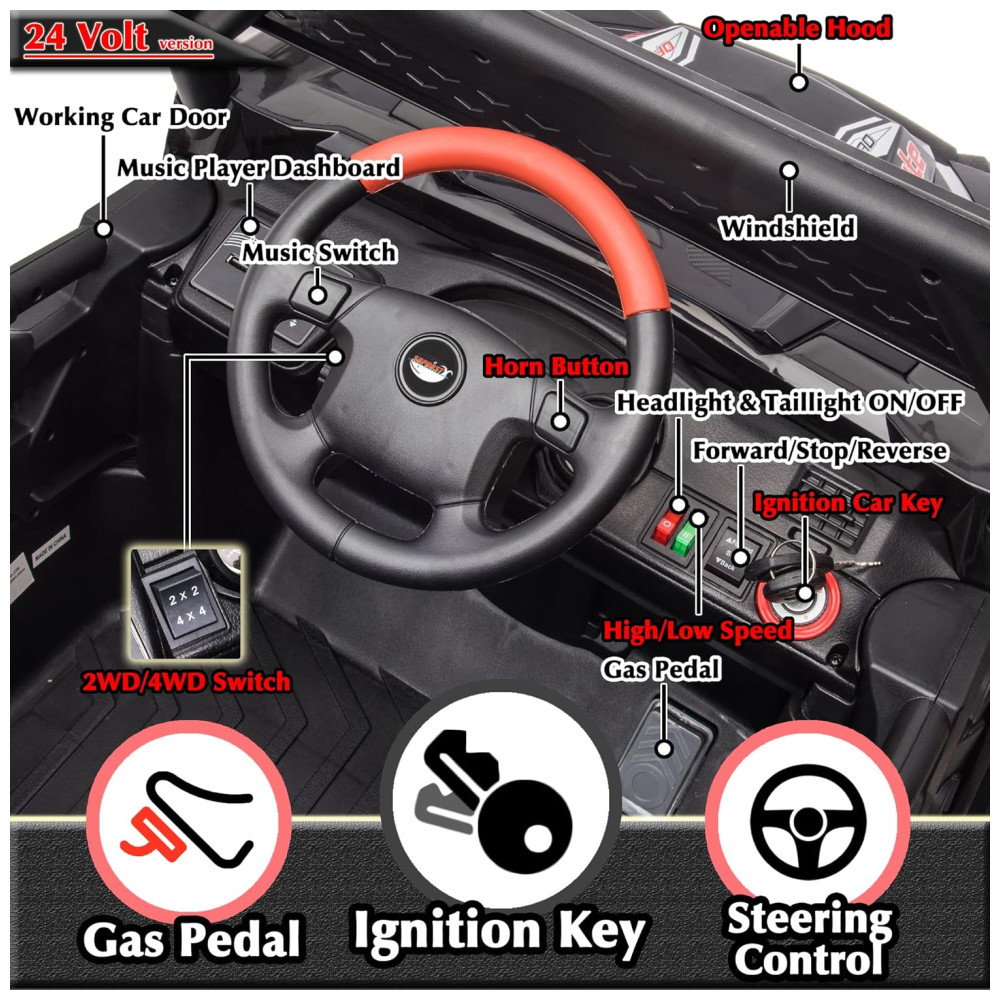 Design Realista e Aventura Off-Road: Com um design inspirado em UTV Off-Road, o carrinho possui partida com chave, cinto de segurança ajustável, luzes LED brilhantes e portas duplas com trava. A estrutura elevada e as rodas à prova de explosão e resistentes ao desgaste garantem um estilo off-road autêntico, permitindo que seus filhos explorem terrenos acidentados com segurança.