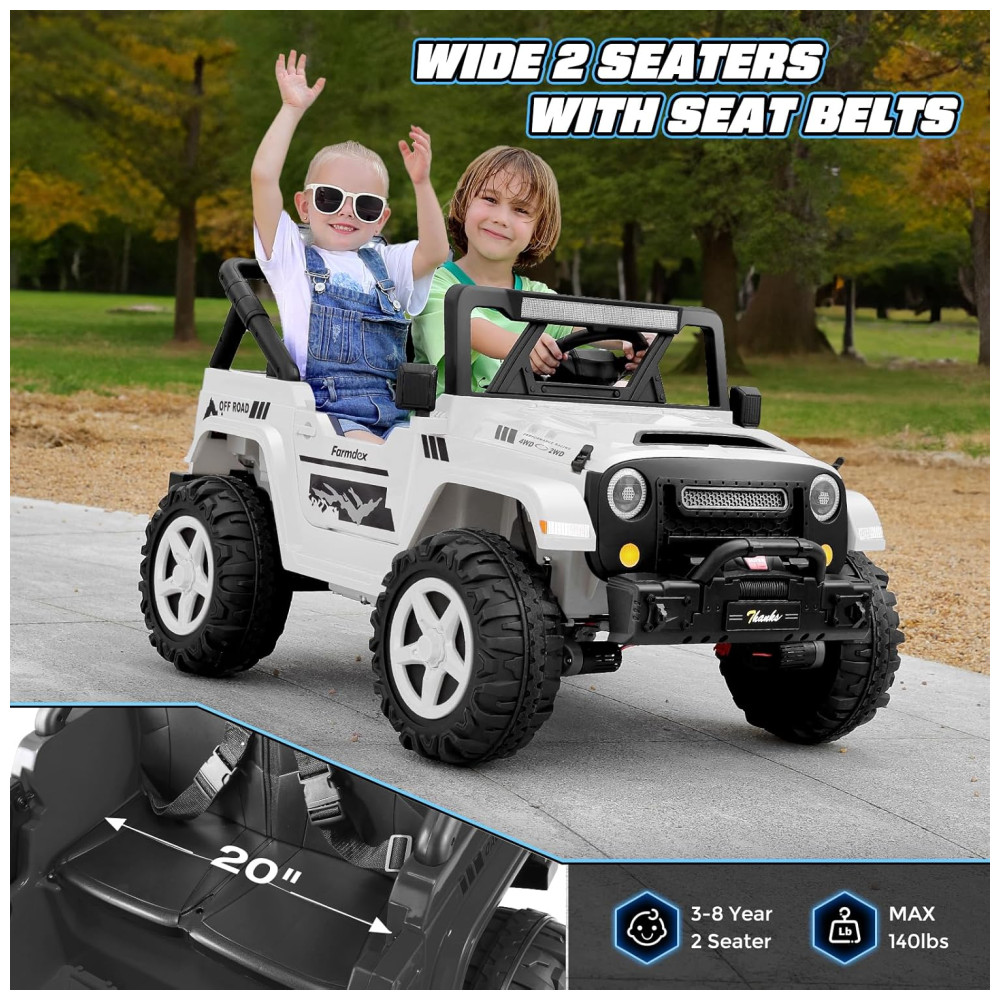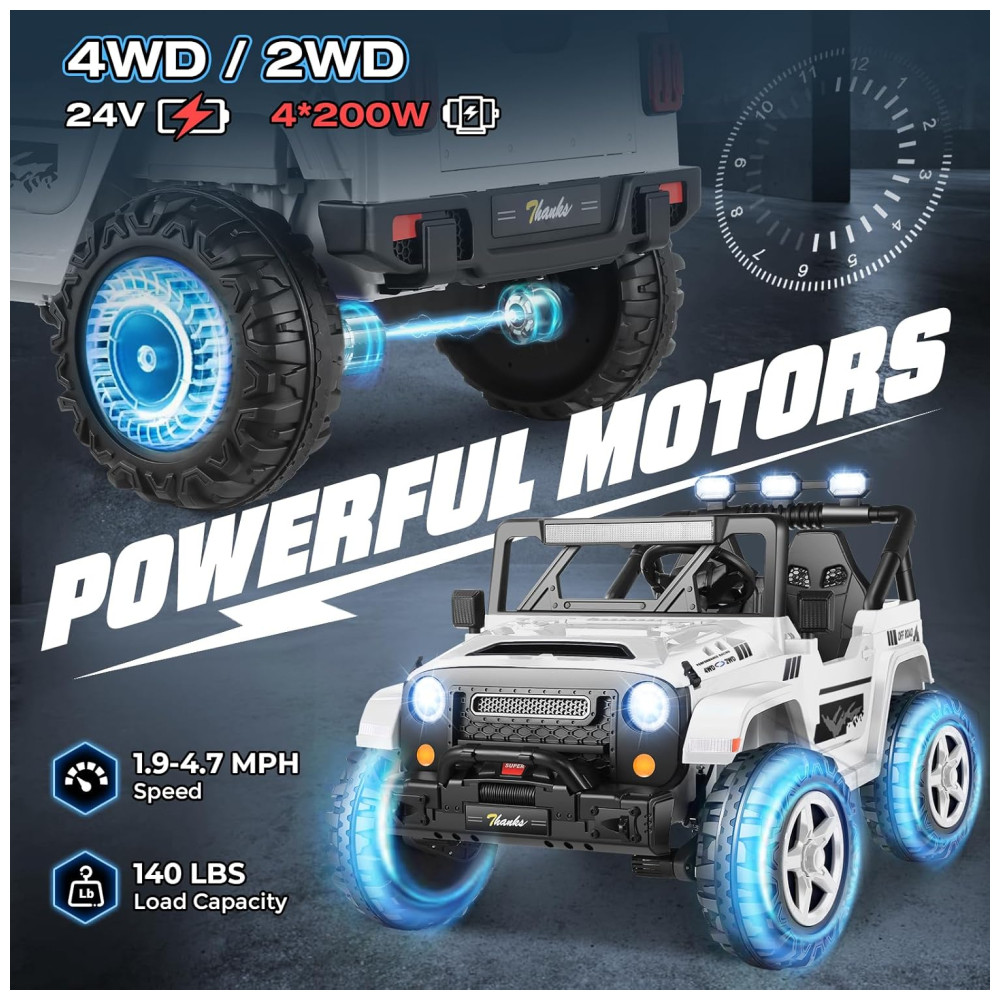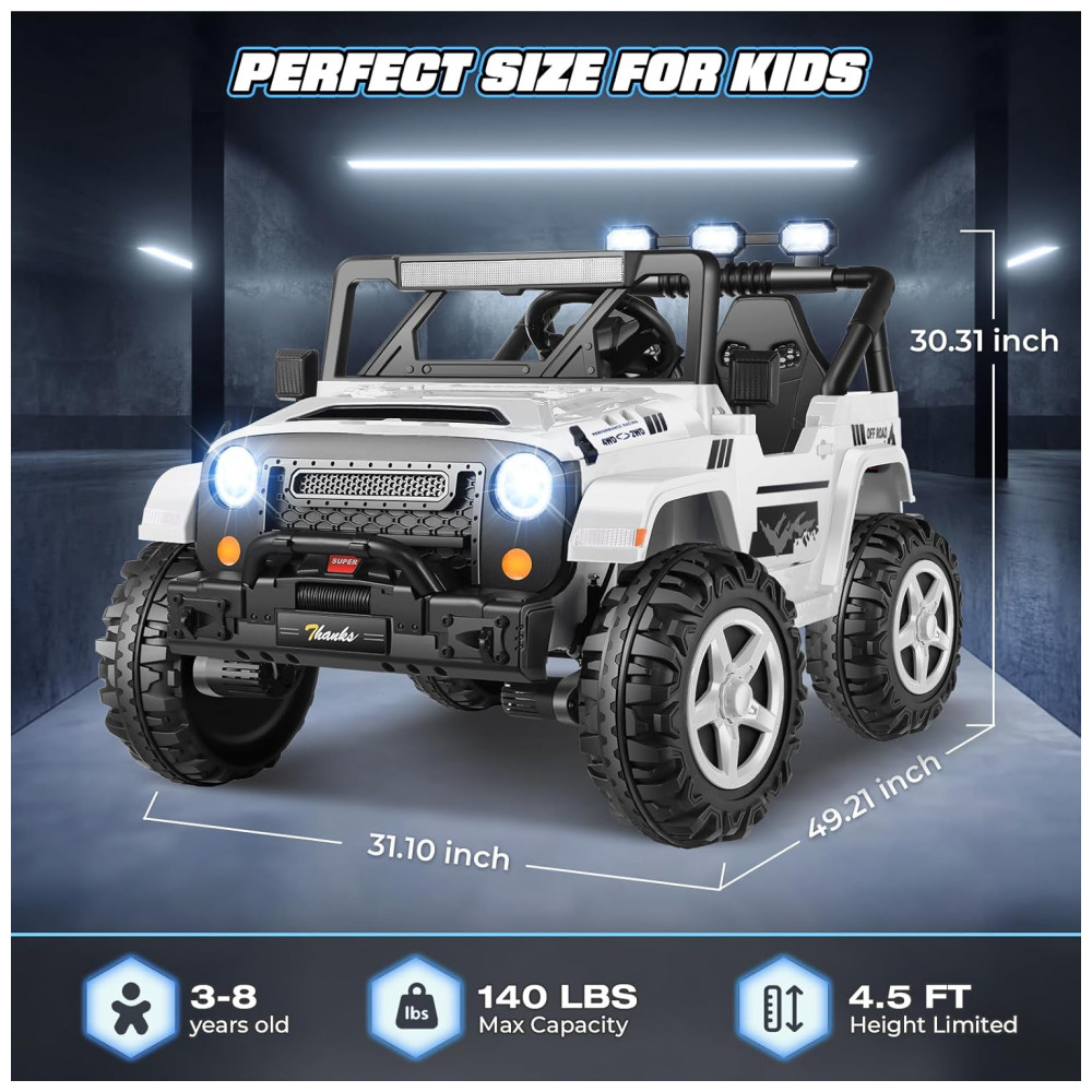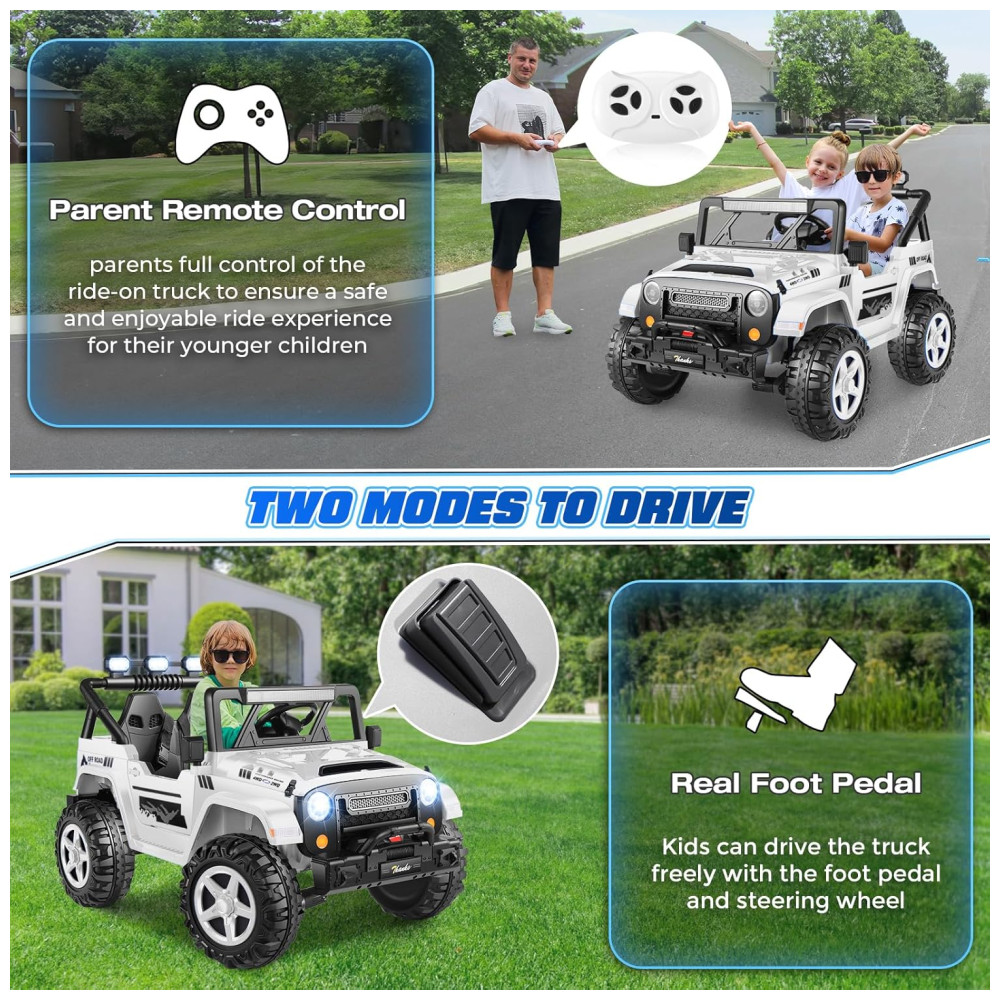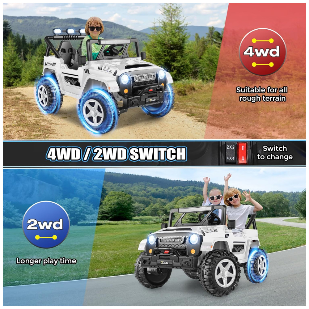 Com um design espaçoso de 43 cm de largura e dois assentos, o carro oferece espaço para duas crianças, garantindo diversão em dobro. Os recursos off-road incluem música integrada, MP3 player, portas USB, faróis LED, lanternas traseiras e luzes de LED sob o carro, proporcionando um visual vibrante e uma experiência de condução ainda mais emocionante.