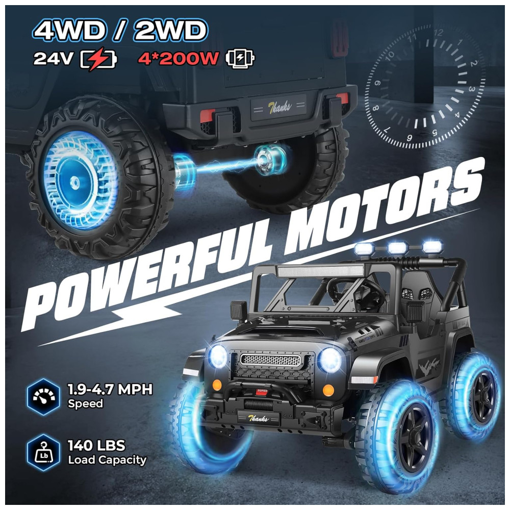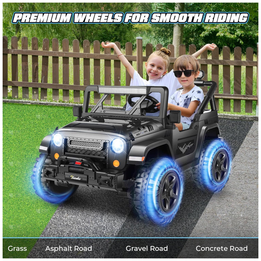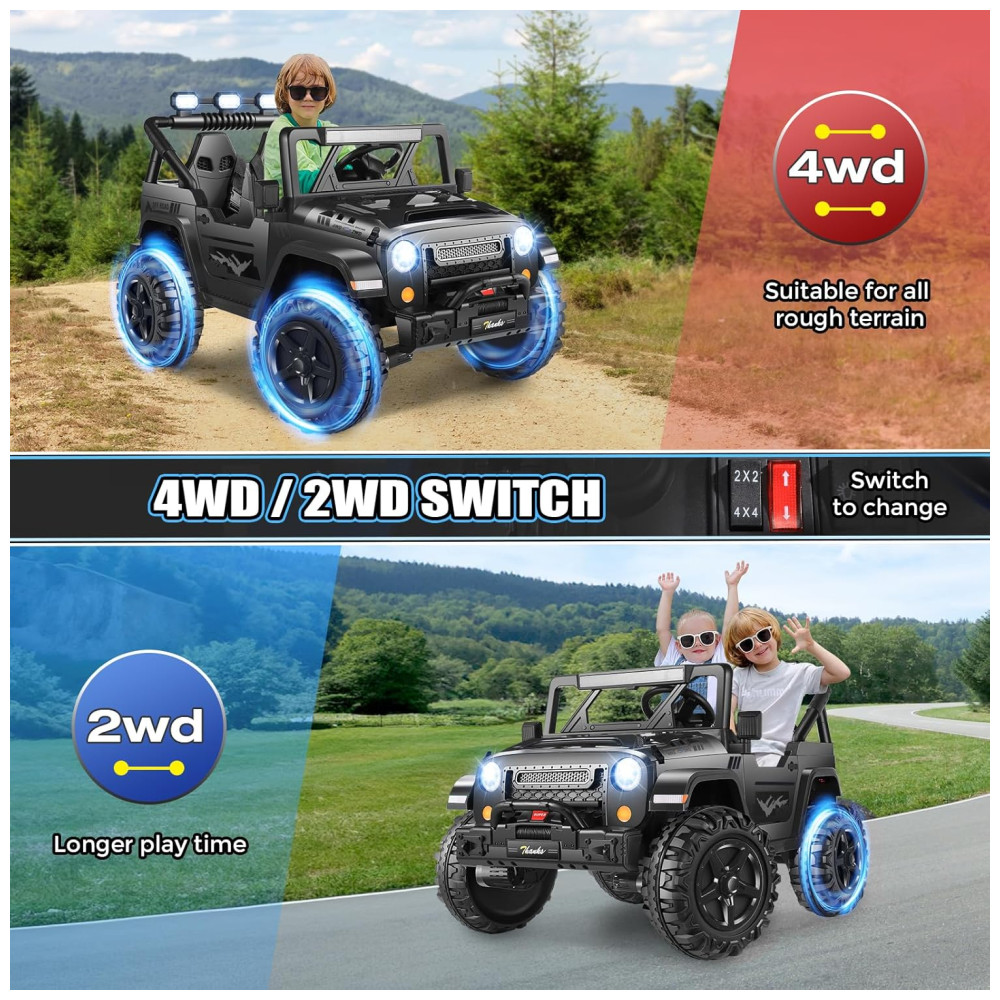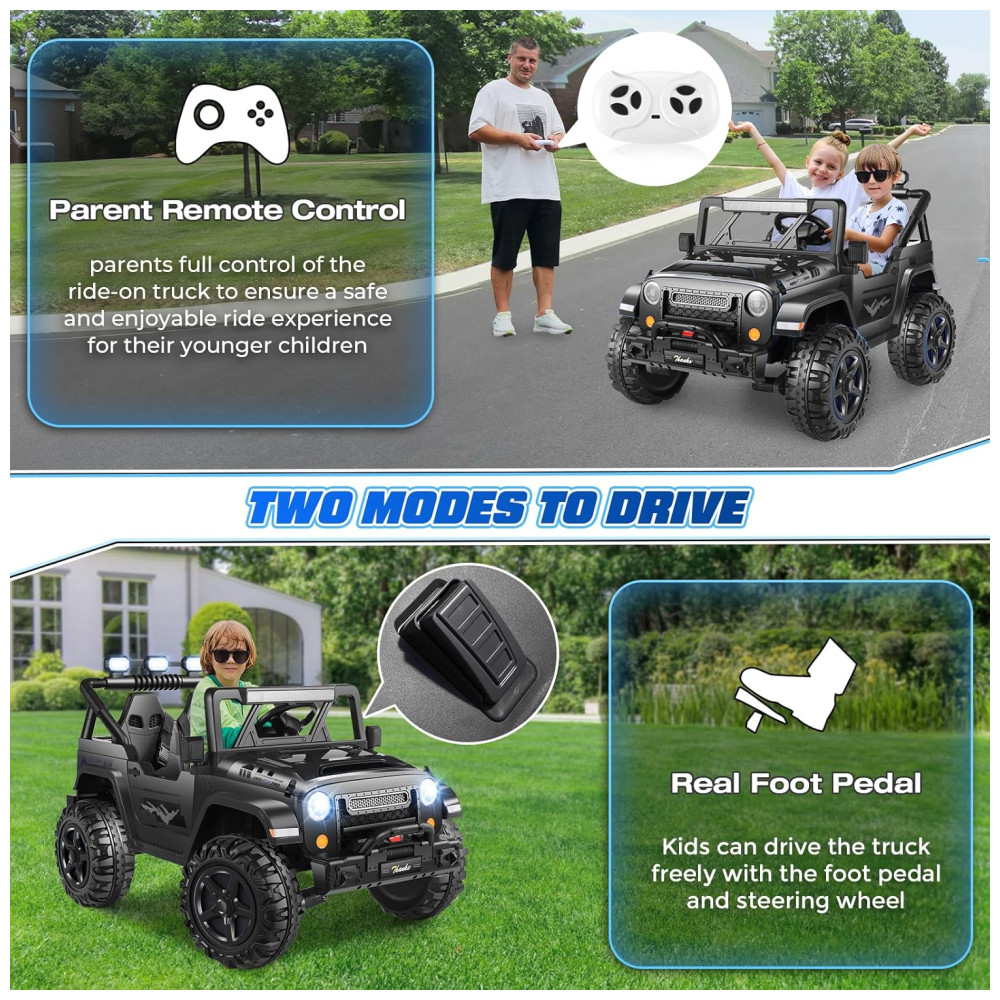 Com um design espaçoso de 43 cm de largura e dois assentos, o carro oferece espaço para duas crianças, garantindo diversão em dobro. Os recursos off-road incluem música integrada, MP3 player, portas USB, faróis LED, lanternas traseiras e luzes de LED sob o carro, proporcionando um visual vibrante e uma experiência de condução ainda mais emocionante.