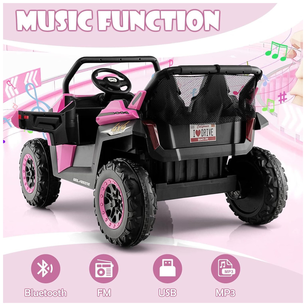 O UTV também inclui uma série de recursos de entretenimento, como música embutida, som real do motor e botões de buzina. Para tornar a condução ainda mais divertida, ele possui conectividade com USB, slot para MP3, FM e Bluetooth, permitindo que você toque as músicas favoritas das crianças durante a brincadeira.
