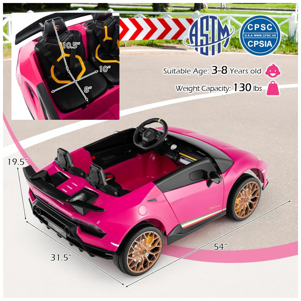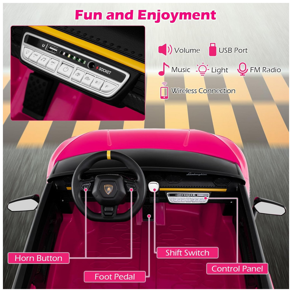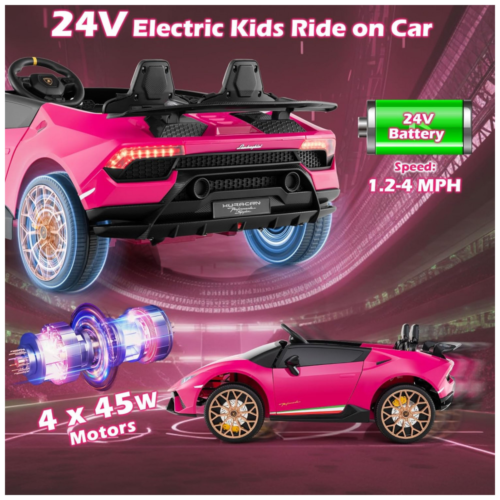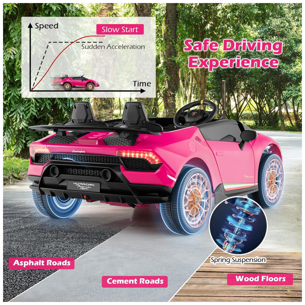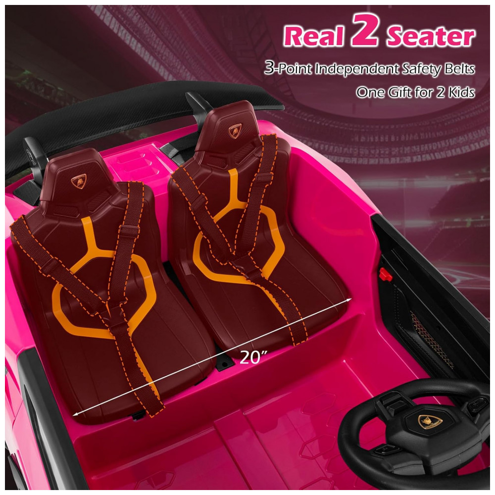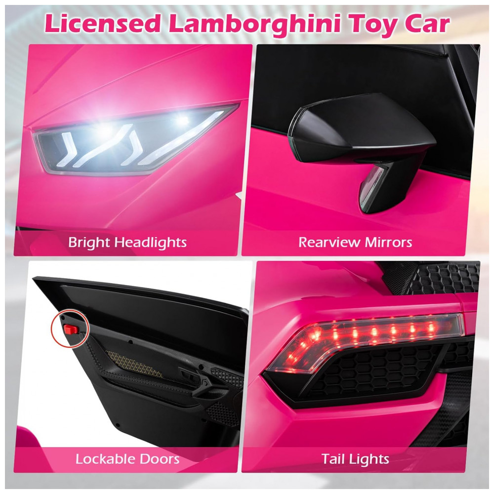 Carro Elétrico Infantil Lamborghini Licenciado 24V 4WD 2 Lugares Controle Remoto Luzes LED Música Bluetooth – Costzon S311 Rosa