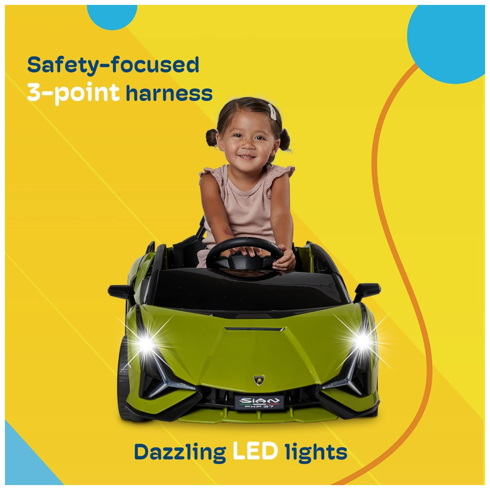 Este carro de passeio oficialmente licenciado da Lamborghini apresenta um design incrível, com faróis de LED, sons realistas de buzina e motor, além de portas hidráulicas que se abrem assim como no verdadeiro Lamborghini.