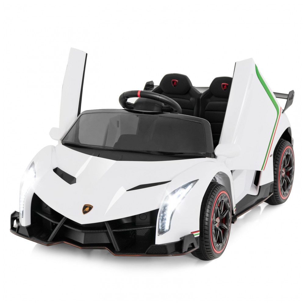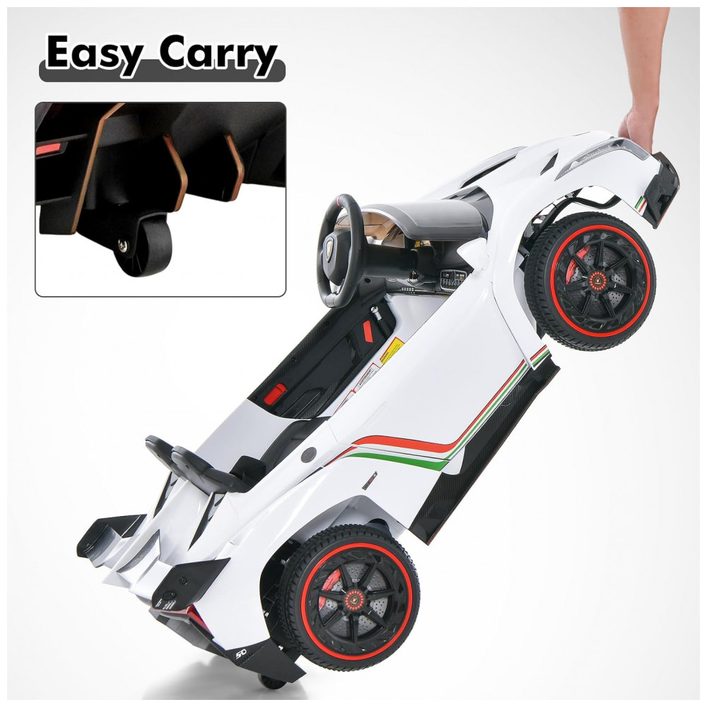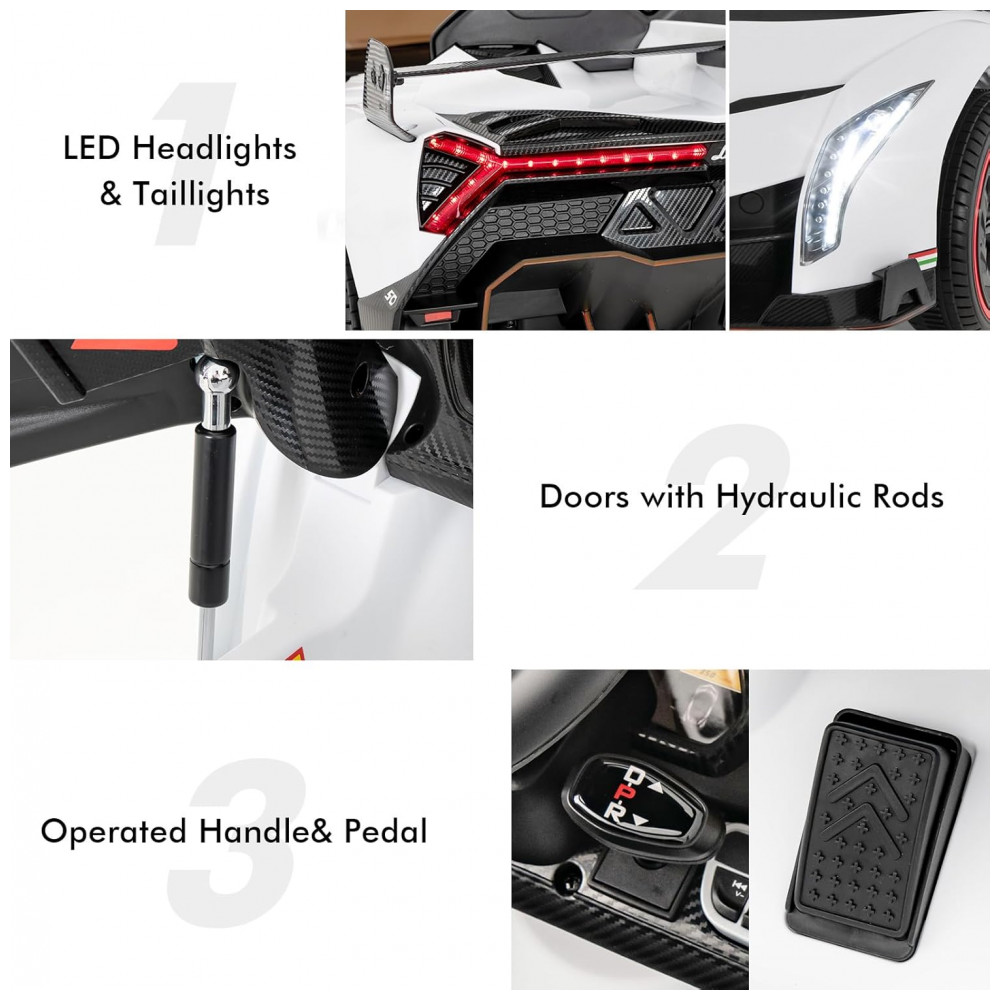 O Carro Elétrico Infantil OLAKIDS Lamborghini Veneno licenciado oferece design esportivo fiel ao modelo real, com portas hidráulicas, faróis e lanternas LED, painel central funcional e spoiler aerodinâmico. Indicado para crianças de 3 a 8 anos (36 a 96 meses), possui bancos duplos, cinto de segurança de dois pontos e portas com travas, proporcionando conforto e proteção.