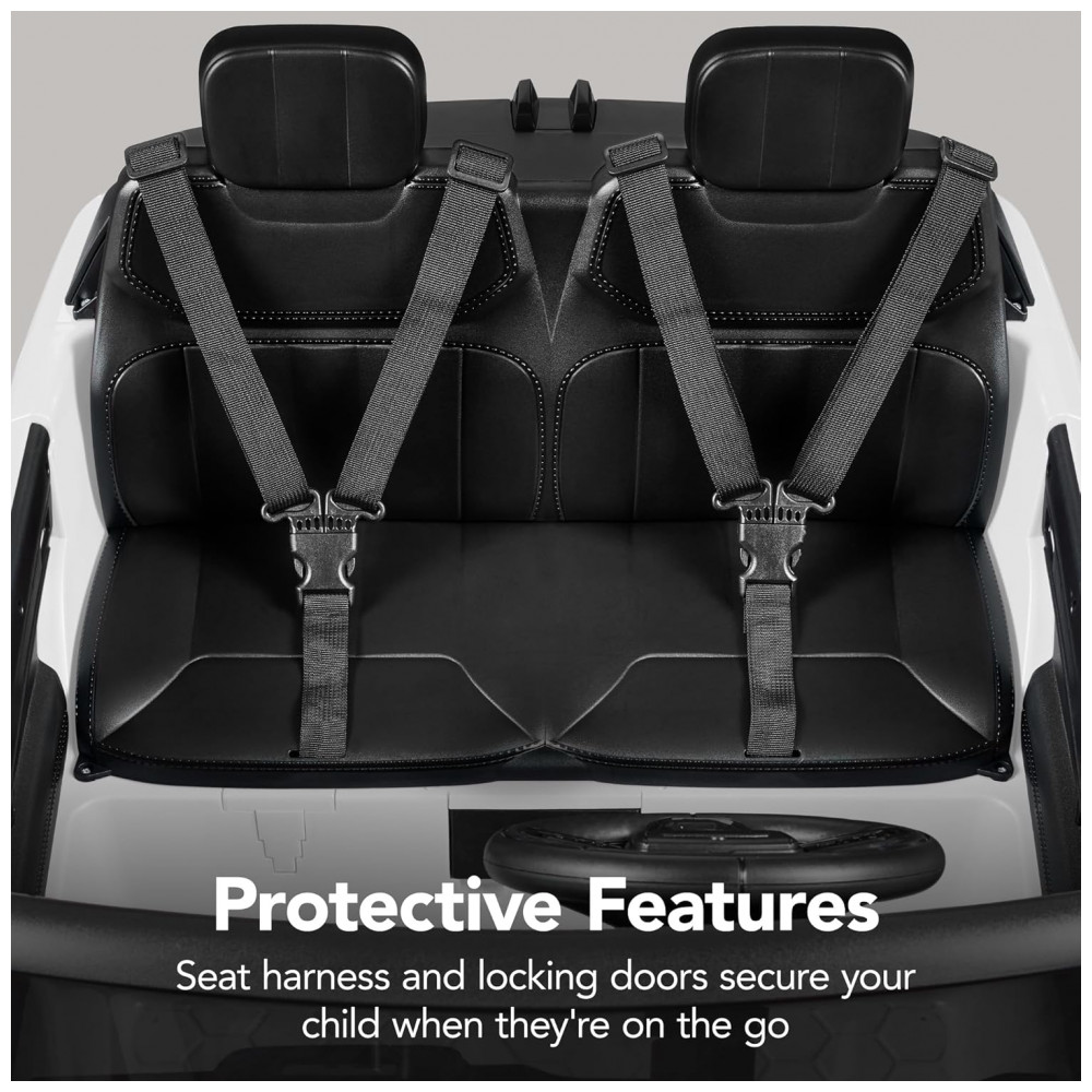 Recursos: Controle remoto parental 2.4GHz, faróis LED funcionais, assento largo, cintos de segurança ajustáveis, som integrado com buzina e Bluetooth