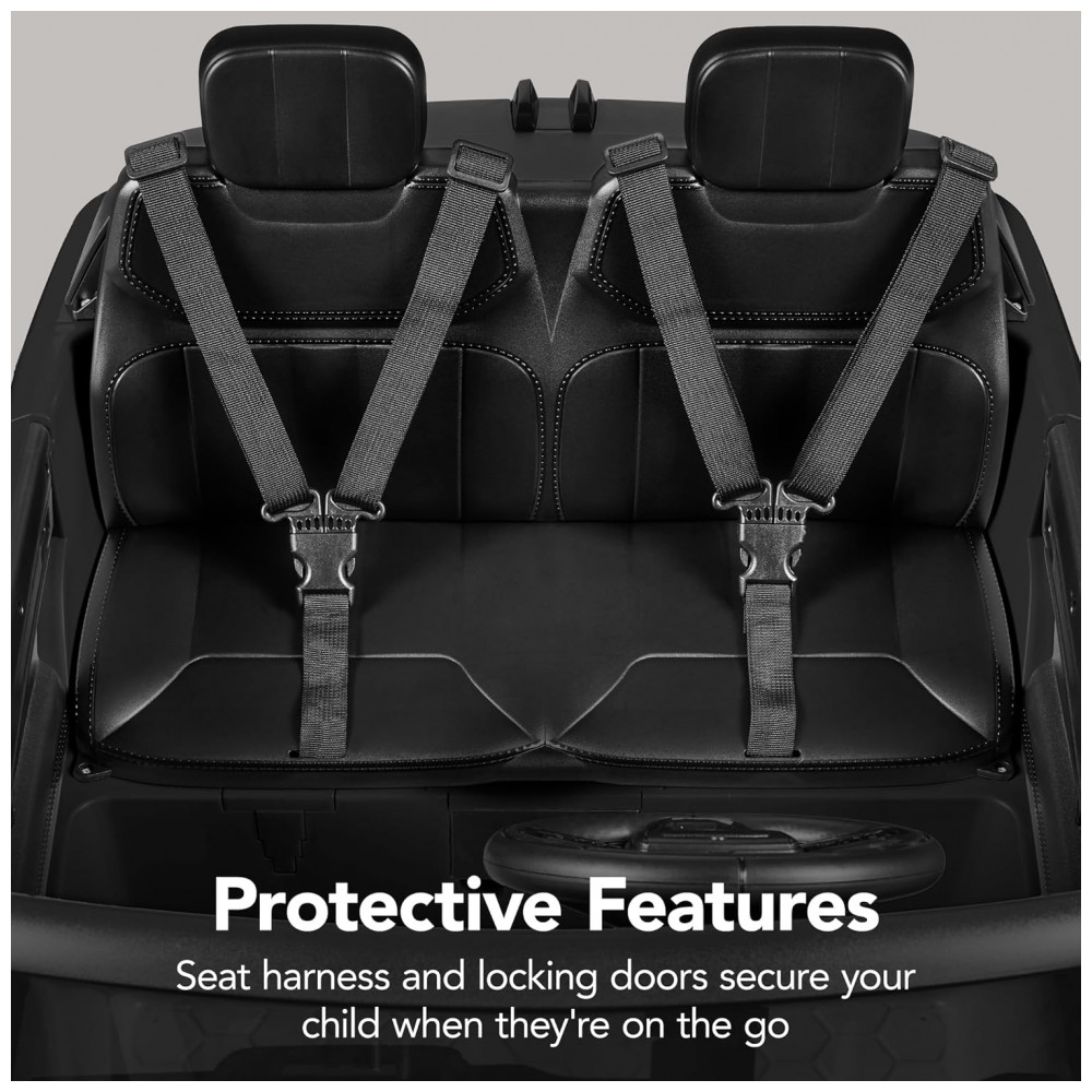 Recursos: Controle remoto parental 2.4GHz, faróis LED funcionais, assento largo, cintos de segurança ajustáveis, som integrado com buzina e Bluetooth