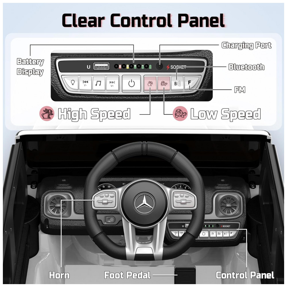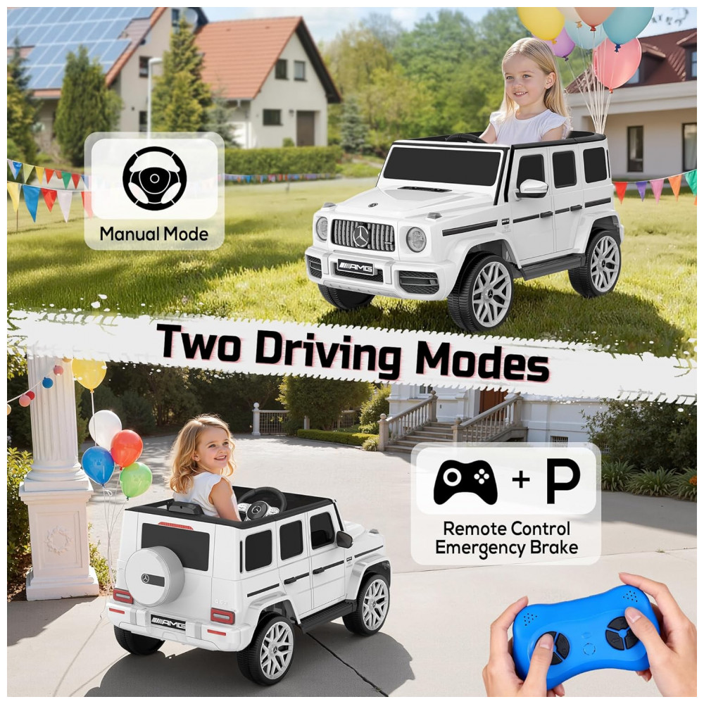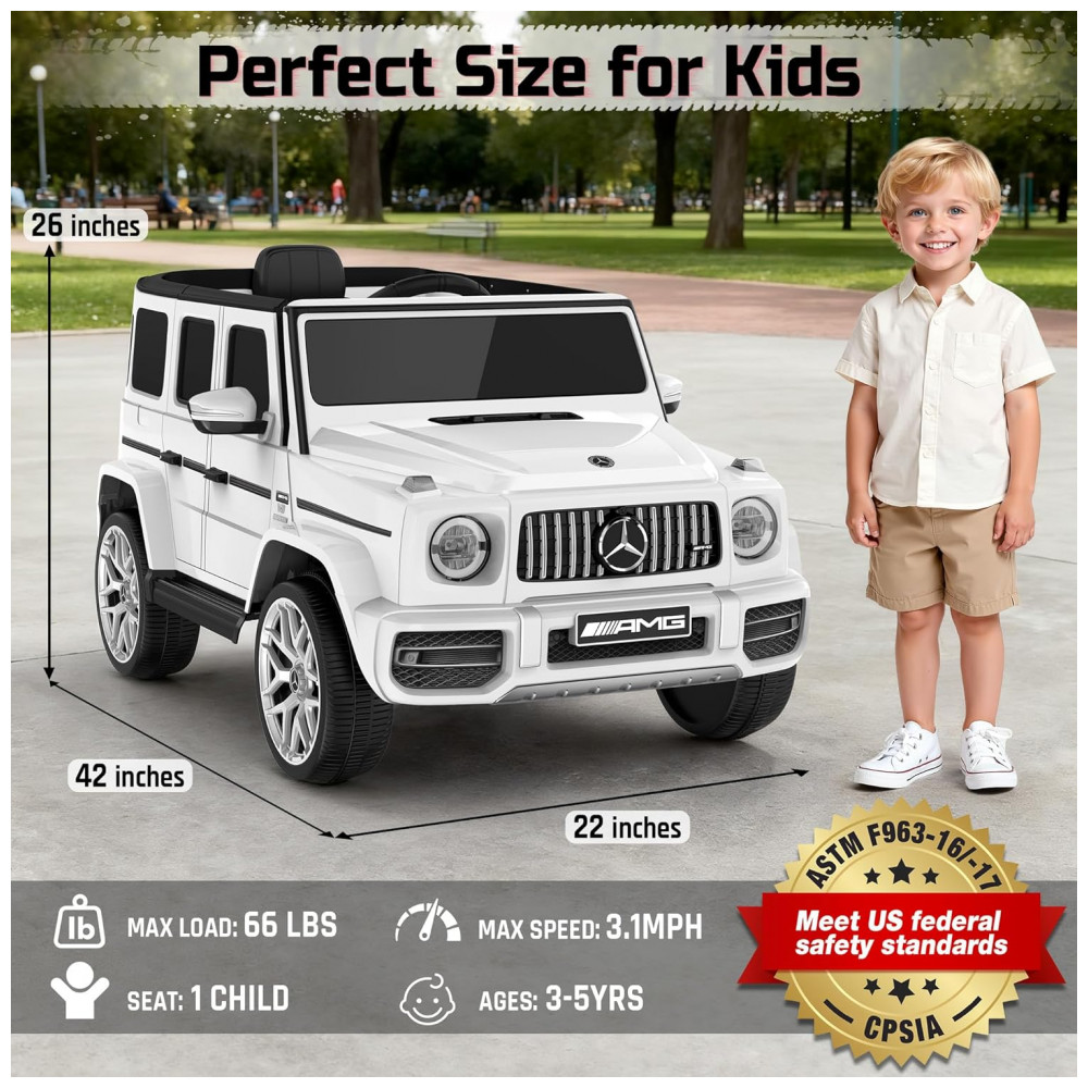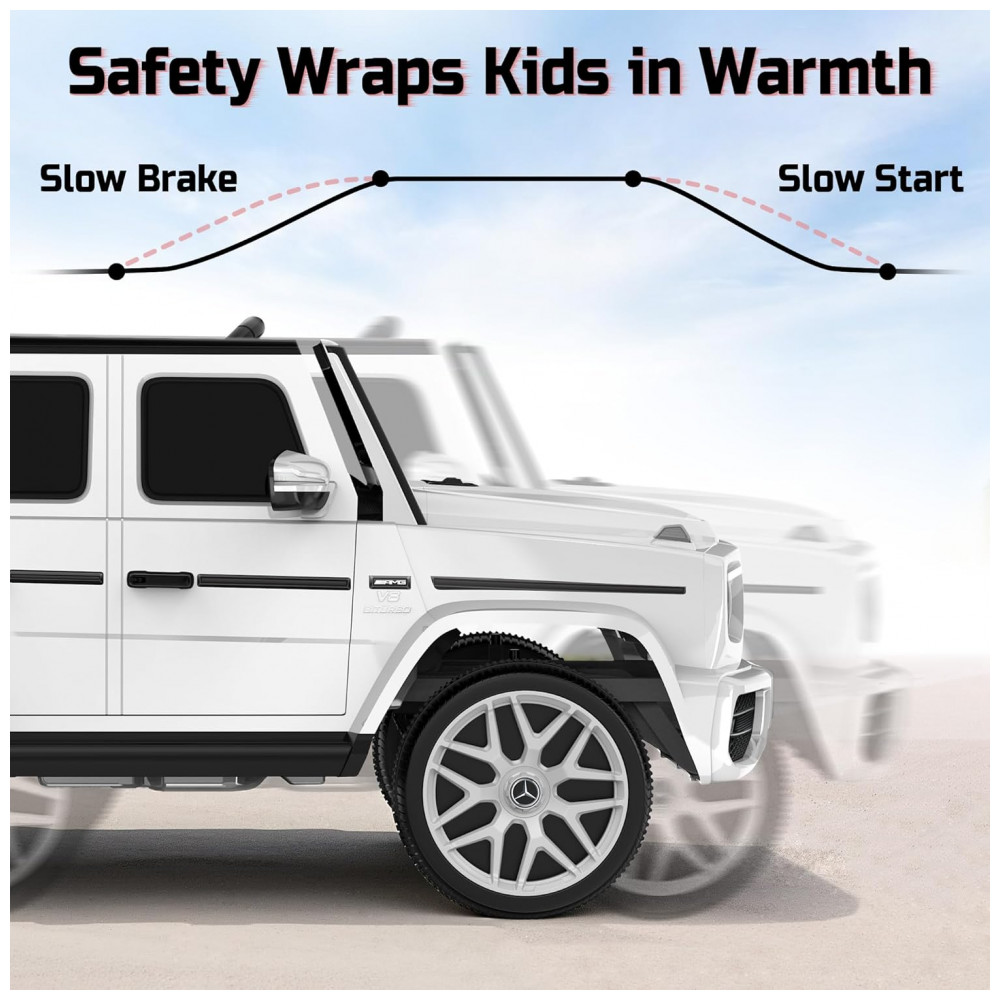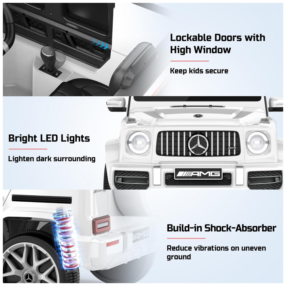 O carro elétrico infantil licenciado Mercedes-Benz G63 garante experiência premium, autenticidade e segurança para crianças de 3 a 5 anos. Equipado com bateria de 12V 7Ah, dois motores de 35W, velocidade máxima de 5 km/h, partida suave, portas com janelas altas e trava, sistema de amortecedores traseiros e cintos de segurança.