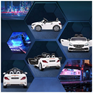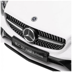 Para aumentar a diversão, o modelo conta com um painel com entradas USB, TF e auxiliar para conectar música, além de 8 músicas pré-instaladas e 7 histórias para entreter as crianças durante o passeio. As luzes LED frontais e traseiras realçam o design autêntico do Mercedes SLC 300, tornando cada viagem ainda mais especial.