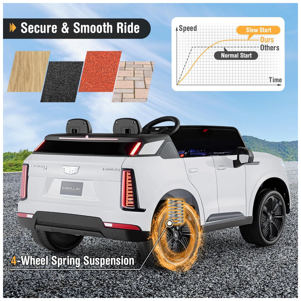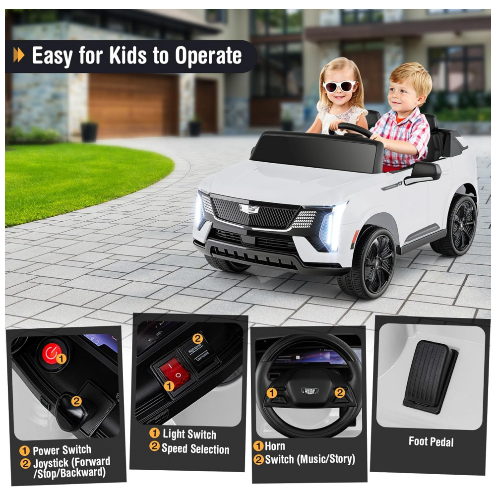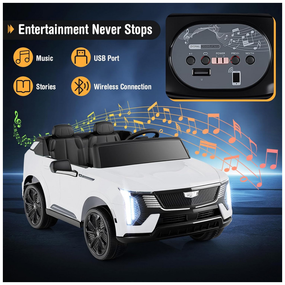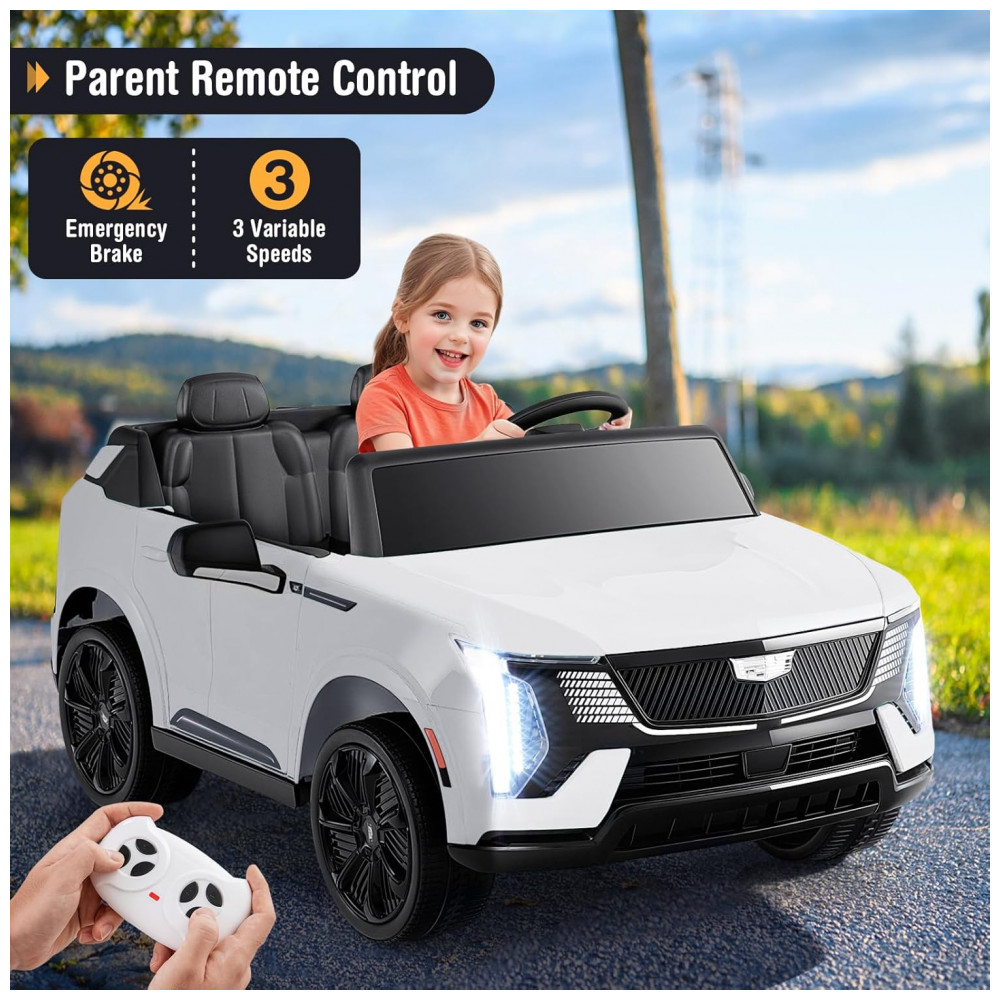 Carro Elétrico Infantil Licenciado Costzon Cadillac 24V 2 Lugares Controle Remoto Suspensão 4 Rodas Música Luzes LED Branco