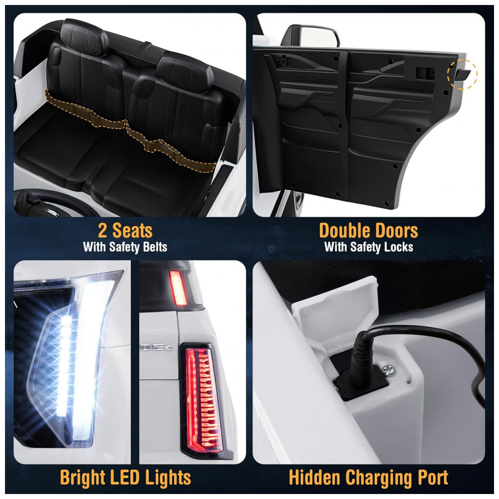 O veículo conta com sistema de suspensão nas quatro rodas para um passeio suave mesmo em terrenos variados, e um sistema de partida suave que evita arrancadas bruscas. Com duas vagas espaçosas equipadas com cintos de segurança ajustáveis, permite que irmãos ou amigos compartilhem o passeio com conforto e segurança. O controle remoto parental 2.4 GHz permite supervisão e controle total, reforçando a segurança.