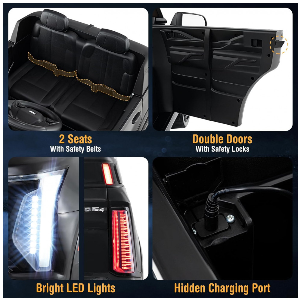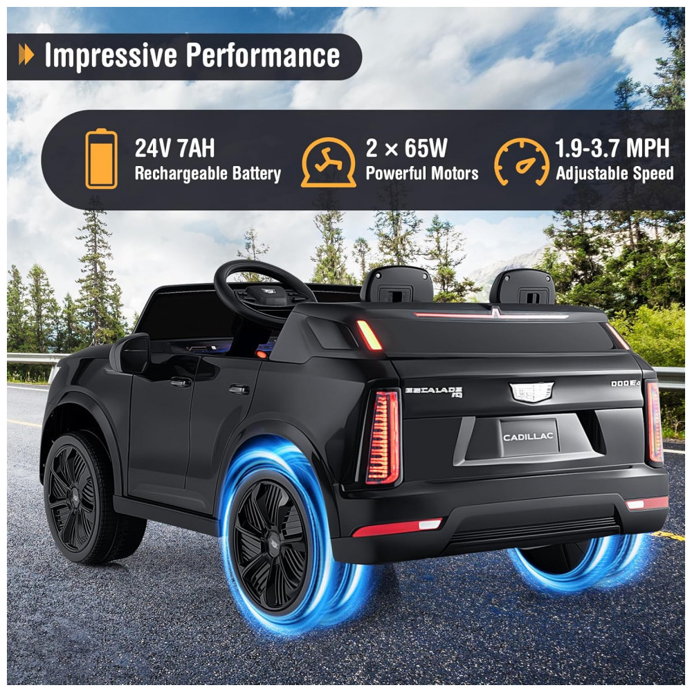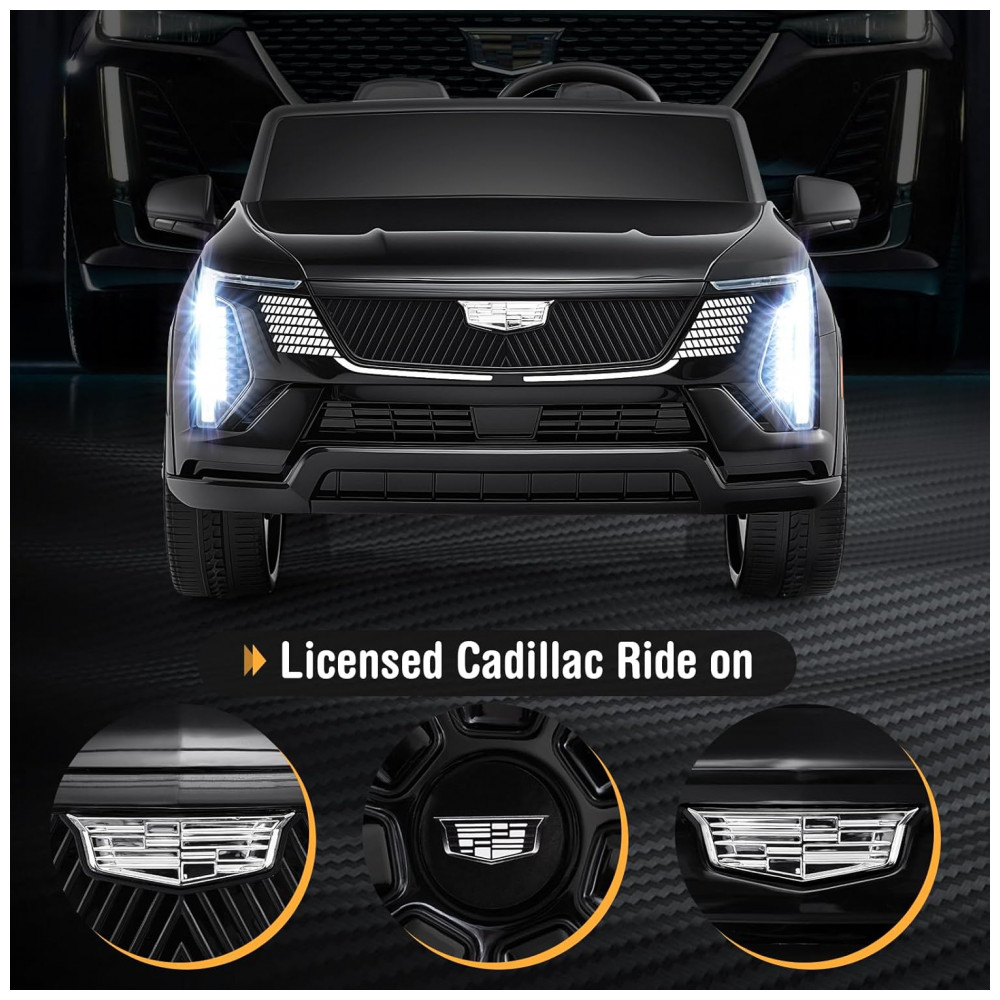 Carro Elétrico Infantil Licenciado Costzon Cadillac 24V 2 Lugares Controle Remoto Suspensão 4 Rodas Música Luzes LED Preto