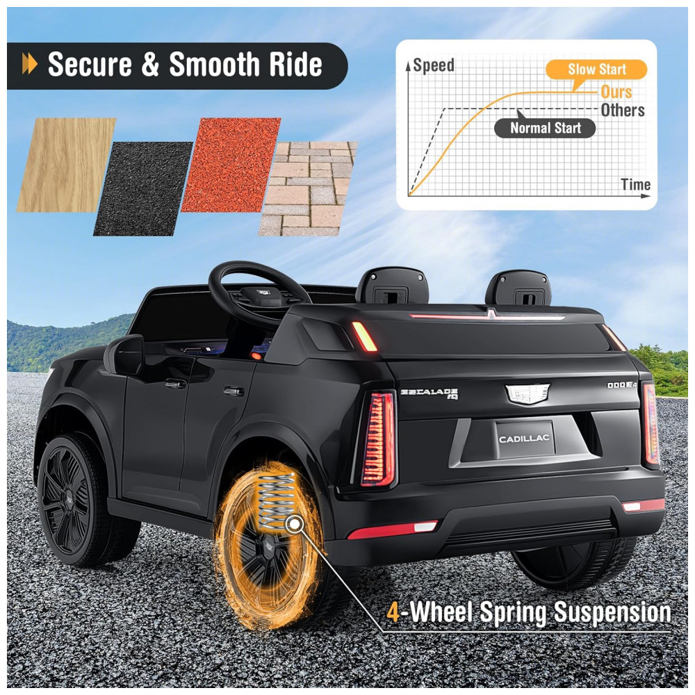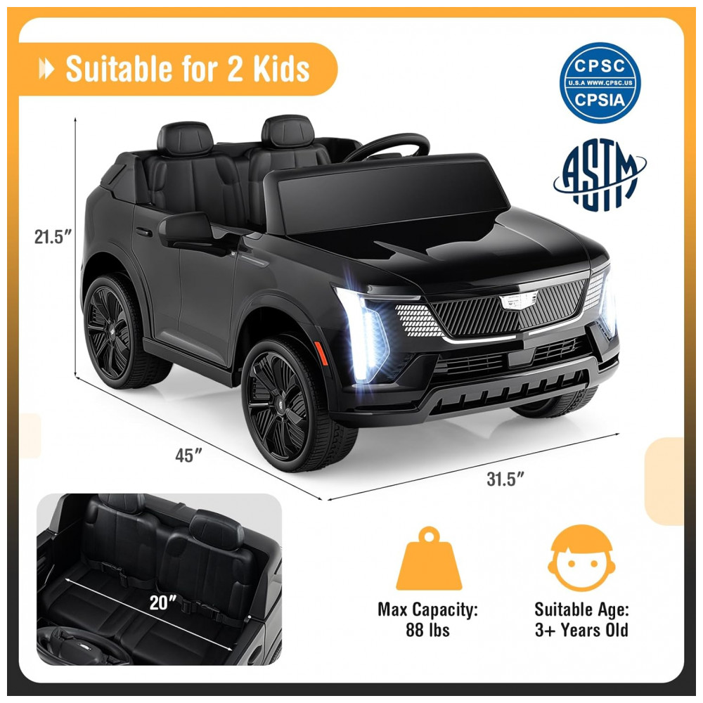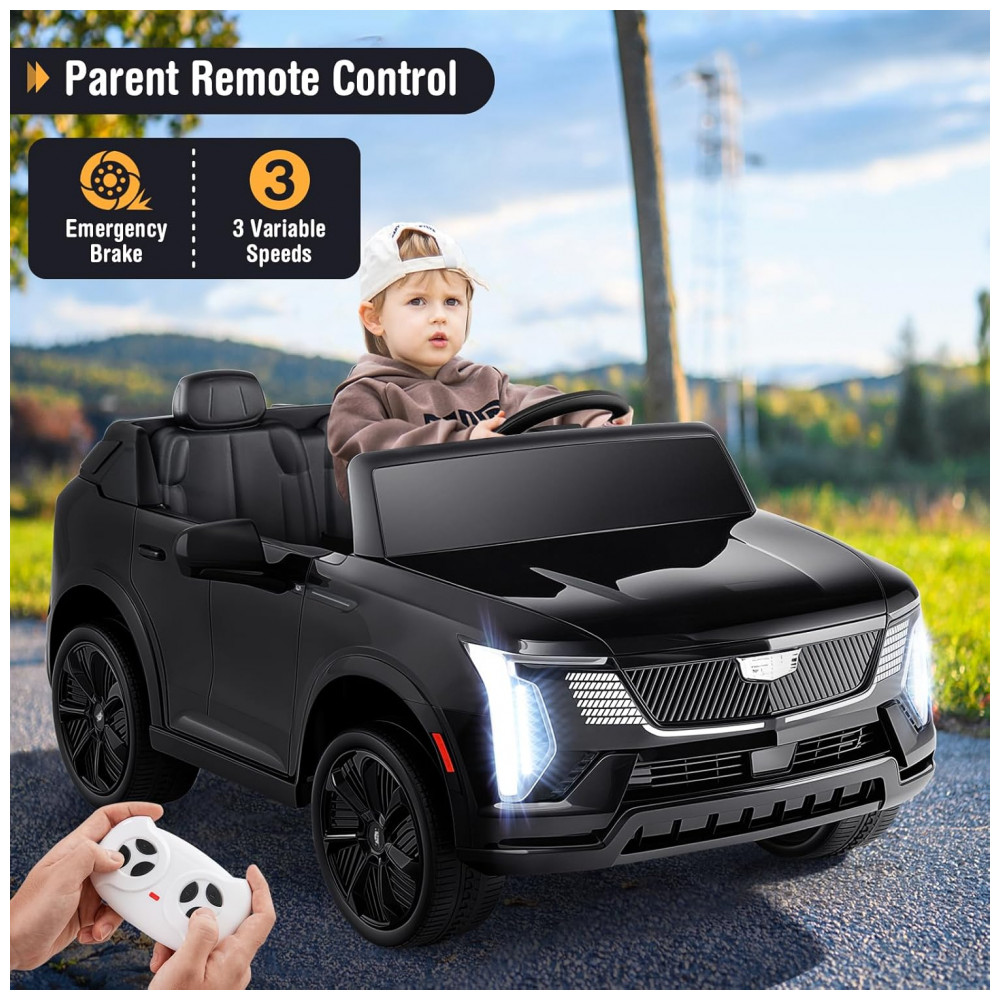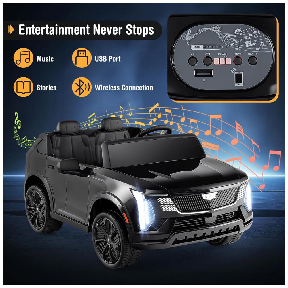 Carro Elétrico Infantil Licenciado Costzon Cadillac 24V 2 Lugares Controle Remoto Suspensão 4 Rodas Música Luzes LED Preto