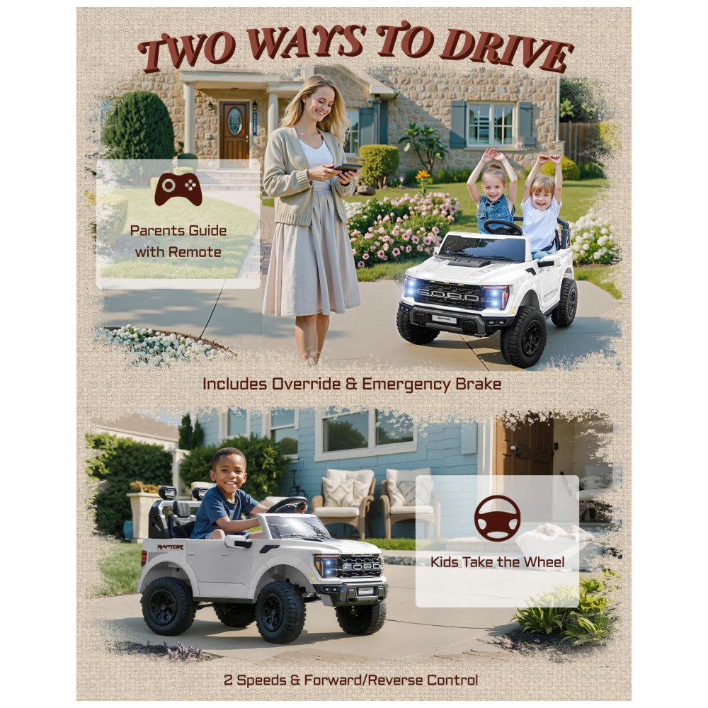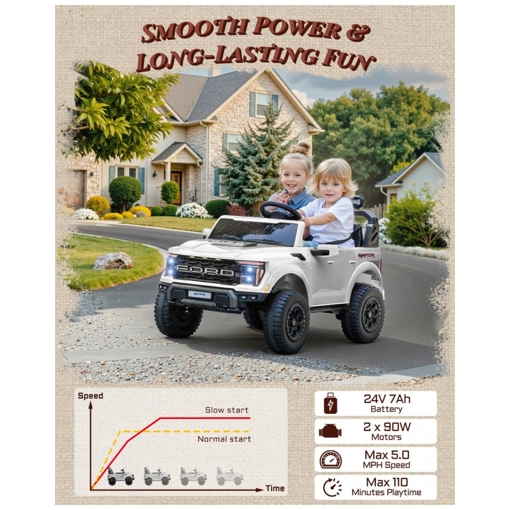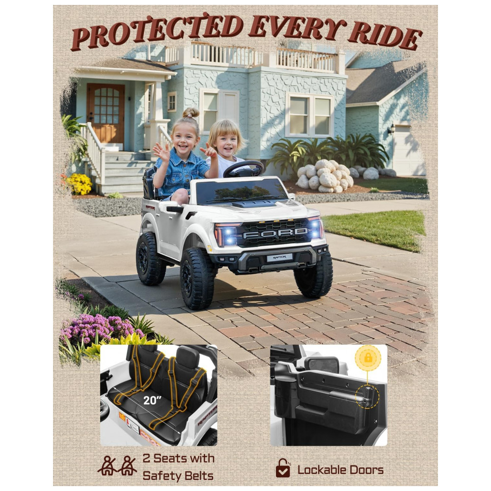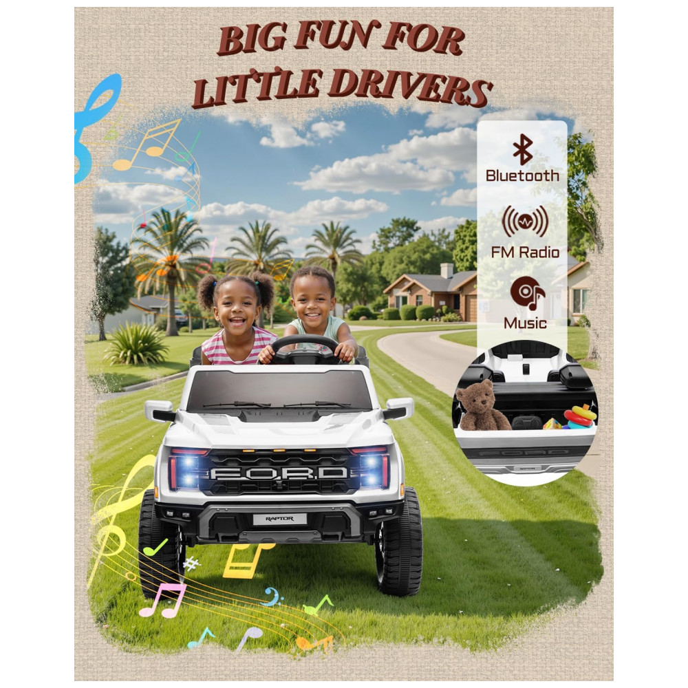 Carro Elétrico Infantil Licenciado Ford F-150 Raptor 24V Branco 2 Lugares com Controle Remoto Bluetooth Luzes LED Baú e Partida Suave