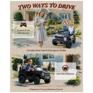 O controle remoto parental de 2,4 GHz possui três velocidades (3,3 km/h, 5,6 km/h e 8 km/h) e freio de emergência com função de prioridade para dar segurança ao controle dos pais. O banco largo de 51 cm acomoda dois pequenos pilotos com conforto.