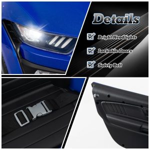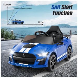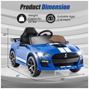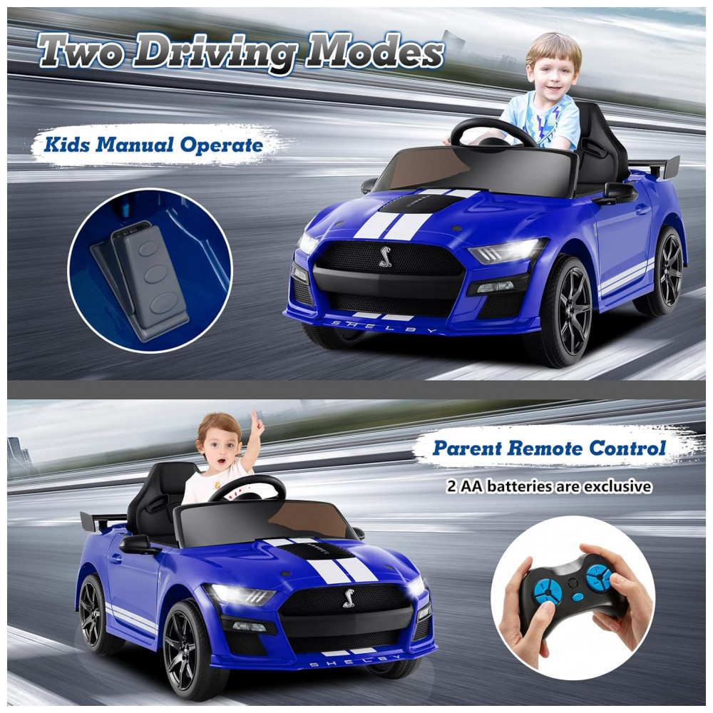 O Carro Elétrico Infantil OLAKIDS Ford Mustang Shelby GT500 licenciado é projetado para oferecer direção realista, com portas duplas, spoiler, faróis de LED funcionais, volante e pedal de aceleração. Para crianças de 3 a 8 anos (37 a 96 meses), suporta até 30 kg e conta com dois modos de operação: pedal/volante para condução manual e controle remoto parental (2.4GHz), incluindo botão de emergência e ajuste de três velocidades.