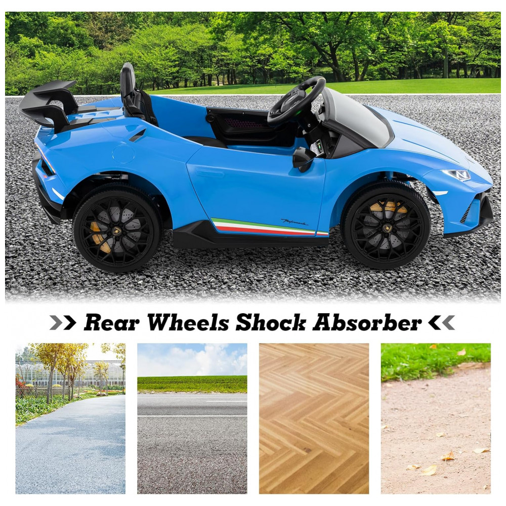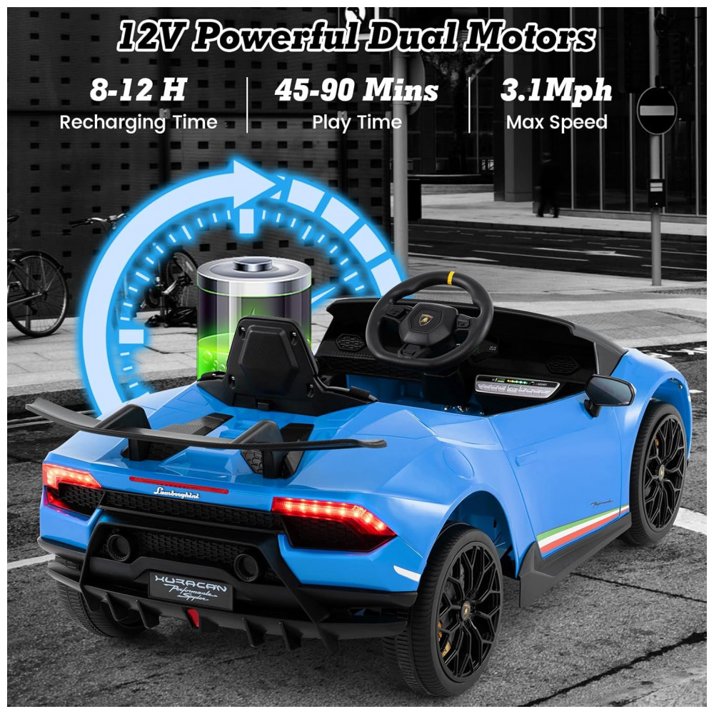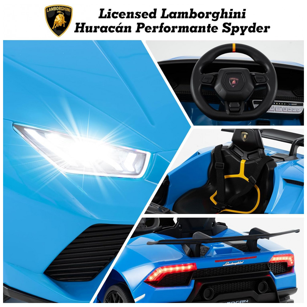 Carro Elétrico Infantil Licenciado Lamborghini Huracan OLAKIDS Azul 12V com Controle Remoto 2 Velocidades Suspensão Bluetooth e USB