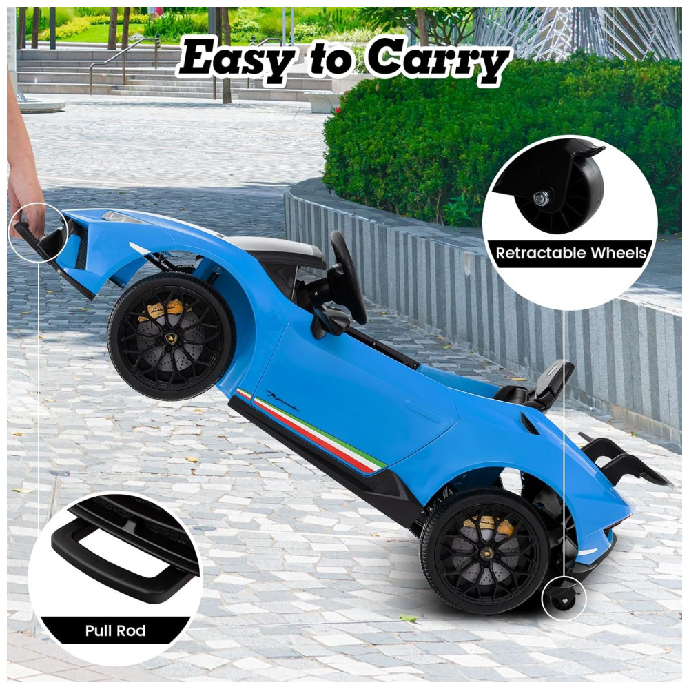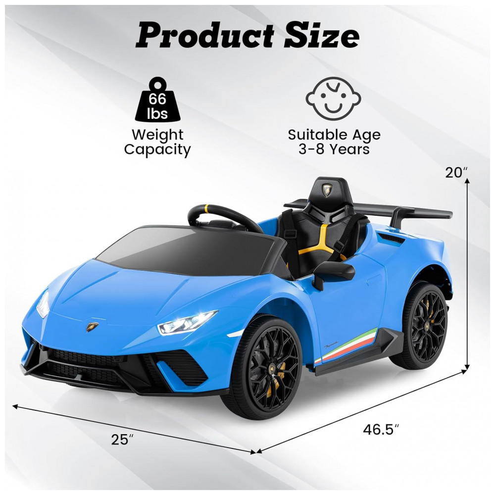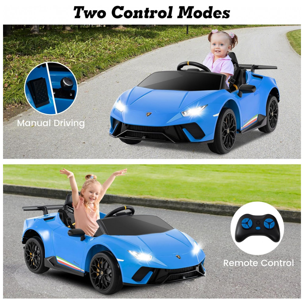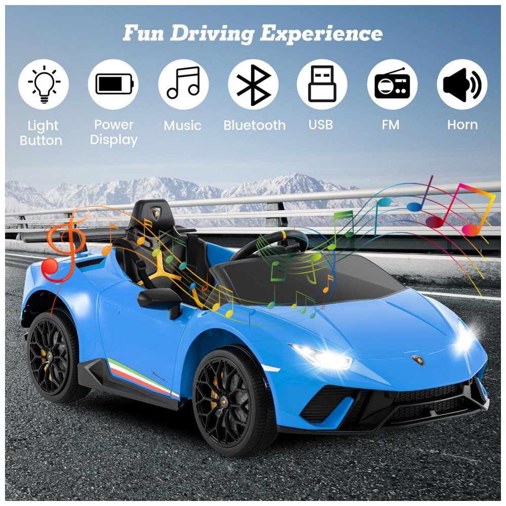 Carro Elétrico Infantil Licenciado Lamborghini Huracan OLAKIDS Azul 12V com Controle Remoto 2 Velocidades Suspensão Bluetooth e USB