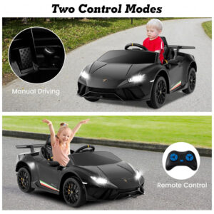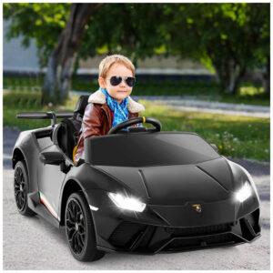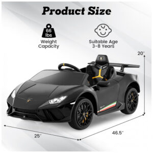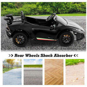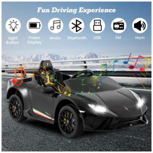 Carro Elétrico Infantil Licenciado Lamborghini Huracan OLAKIDS Preto 12V com Controle Remoto 2 Velocidades Suspensão Bluetooth e USB