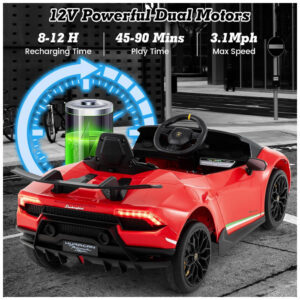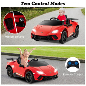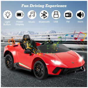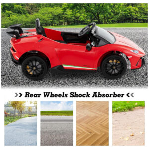 Carro Elétrico Infantil Licenciado Lamborghini Huracan OLAKIDS Vermelho 12V com Controle Remoto 2 Velocidades Suspensão Bluetooth e USB
