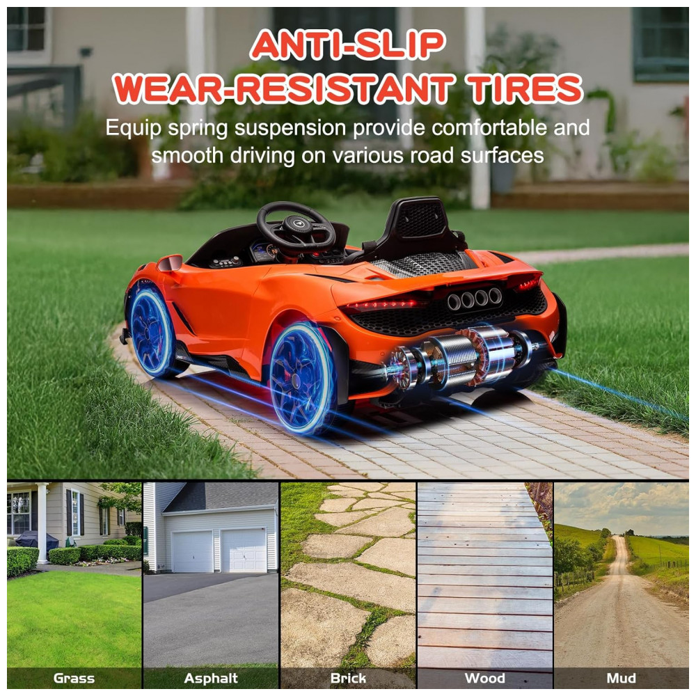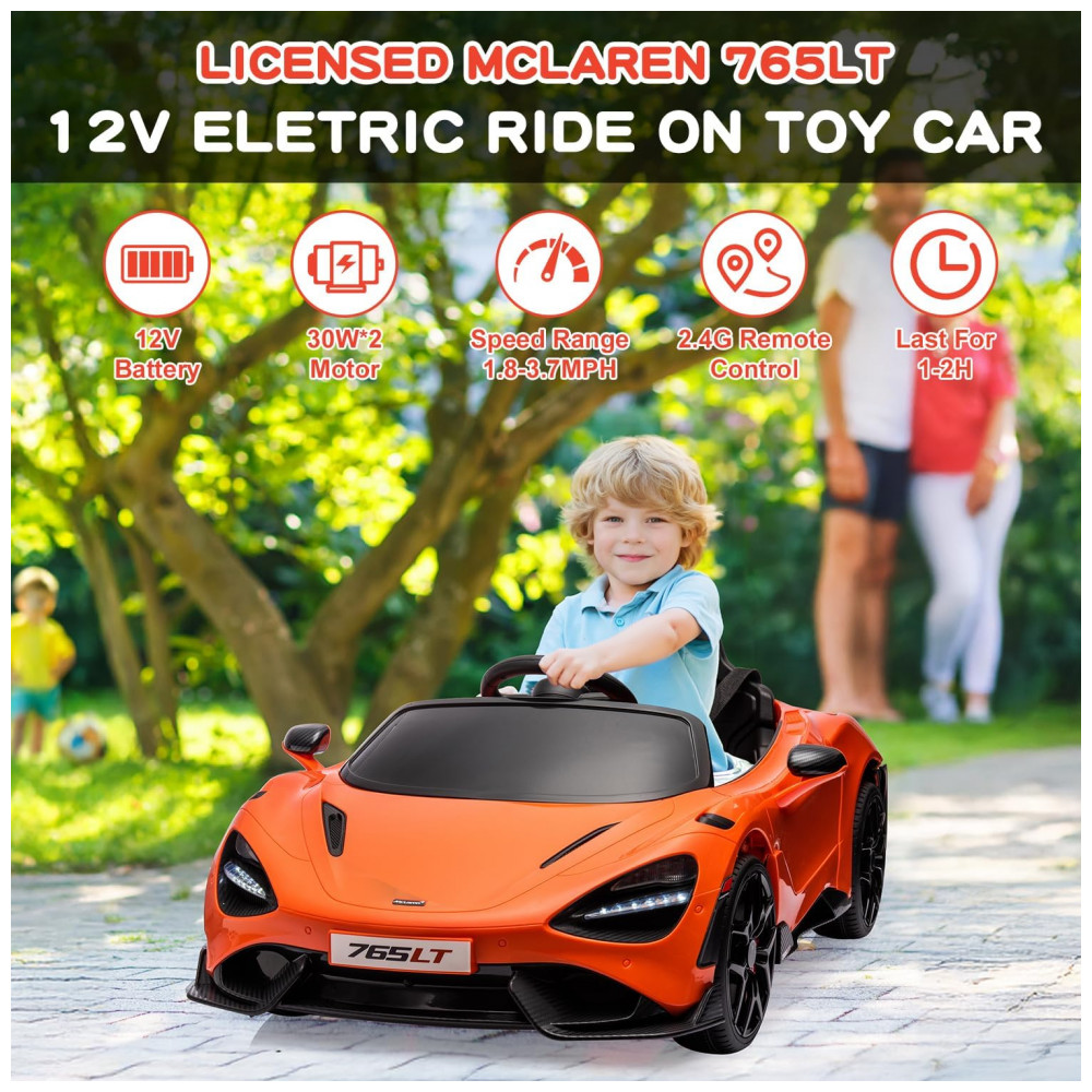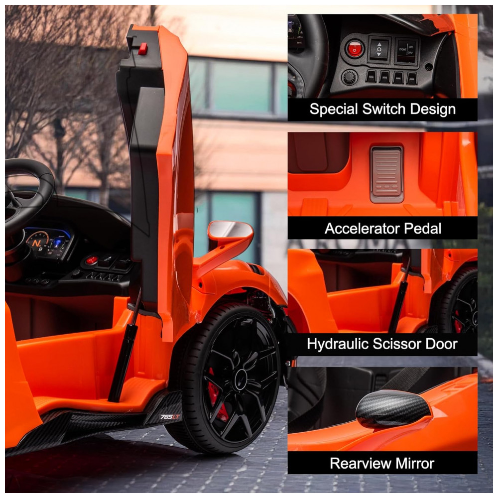 O carro elétrico infantil McLaren765LT licenciado da MUKIDY reproduz detalhes realistas, incluindo faróis em LED, sons personalizados e design fiel ao modelo esportivo em escala 1:1. Desenvolvido em plástico resistente e atóxico certificado ASTM, acomoda uma criança de até 29,9 kg, com assento largo, cinto de segurança ajustável e portas com travamento. Possui suspensão por molas, pneus em polipropileno antiderrapantes e sistema de partida suave para aceleração segura.