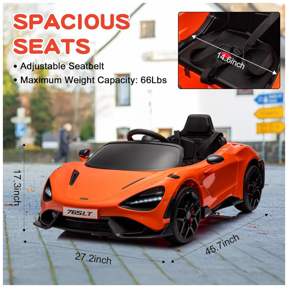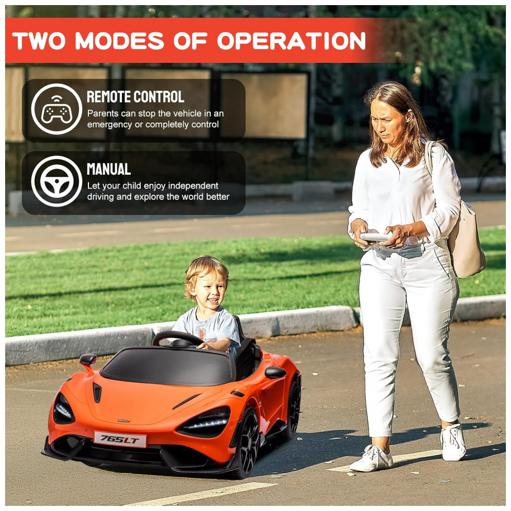 Carro Elétrico Infantil McLaren765LT MUKIDY Laranja 12V Controle Remoto Música Luzes LED 3 Velocidades Cinto Segurança Modelo Licenciado