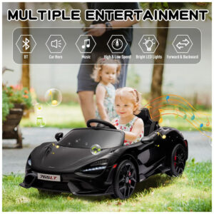 O carro elétrico infantil McLaren765LT licenciado da MUKIDY reproduz detalhes realistas, incluindo faróis em LED, sons personalizados e design fiel ao modelo esportivo em escala 1:1. Desenvolvido em plástico resistente e atóxico certificado ASTM, acomoda uma criança de até 29,9 kg, com assento largo, cinto de segurança ajustável e portas com travamento. Possui suspensão por molas, pneus em polipropileno antiderrapantes e sistema de partida suave para aceleração segura.