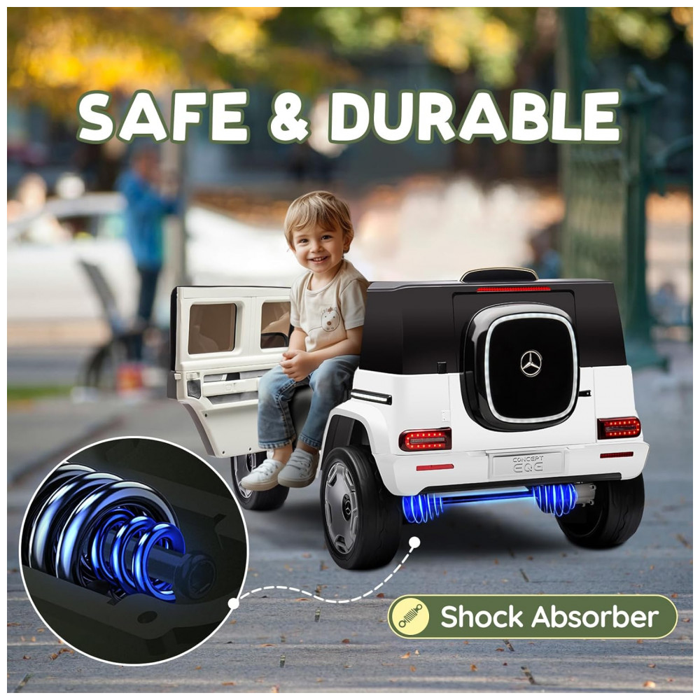 O Carro Elétrico Infantil Mercedes-Benz Forever Source foi desenvolvido para proporcionar uma experiência realista de condução, aliando tecnologia, segurança e conforto. Licenciado, exibe design luxuoso EQG, com detalhes fieis ao modelo original e acabamento sofisticado. Seu sistema duplo de controle permite que a criança dirija manualmente ou que os pais conduzam via controle remoto, garantindo máxima segurança. Equipado com recursos como iluminação em LED, reprodutor de música e histórias, conexão USB e buzina, o produto oferece entretenimento variado. O assento espaçoso e o cinto de segurança de três pontos favorecem o conforto e a proteção durante o uso, sendo indicado para crianças de 37 a 96 meses (aproximadamente 3 a 8 anos), até 30 kg. A suspensão com amortecedores de mola absorve impactos, tornando o passeio mais suave em diferentes tipos de terreno.
