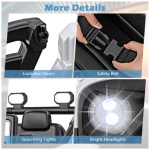 O modelo permite operação manual via volante e pedal ou controle parental remoto (2,4GHz), com função de frenagem de emergência e ajuste de três velocidades (até 6 km/h). Dispõe de portas duplas com trava, cinto de segurança, mola traseira para absorção de impactos e estrutura em polipropileno robusto.