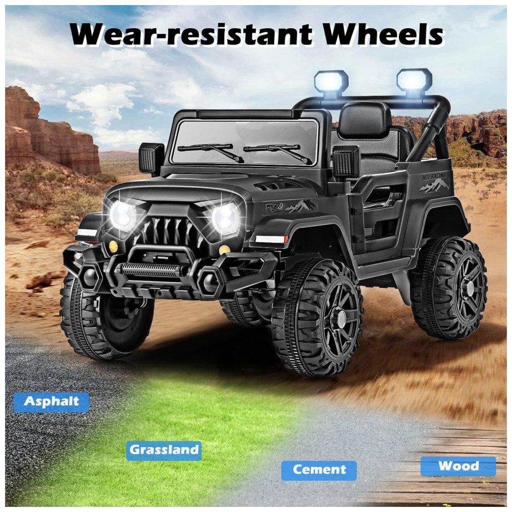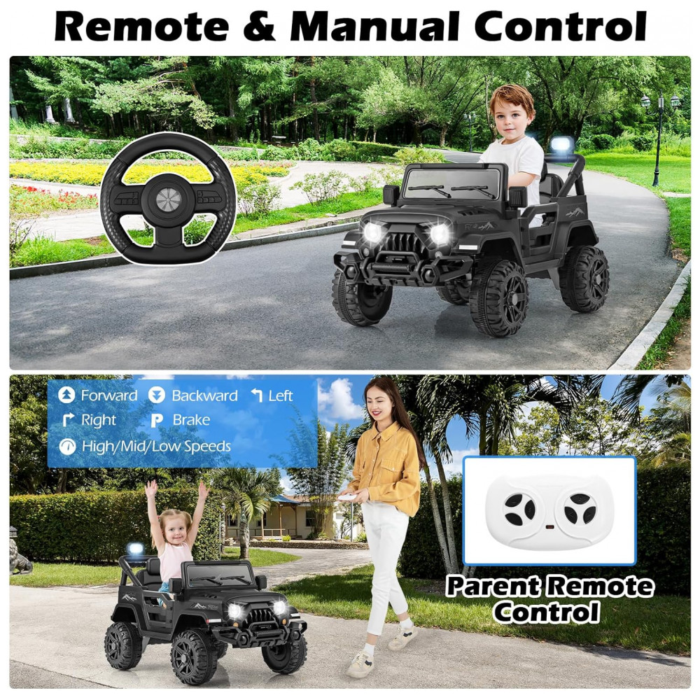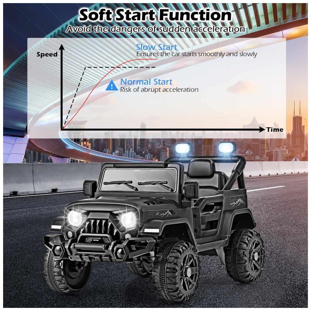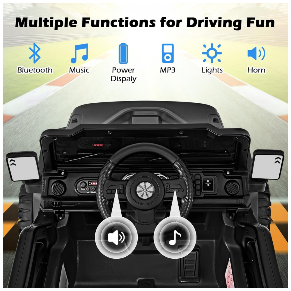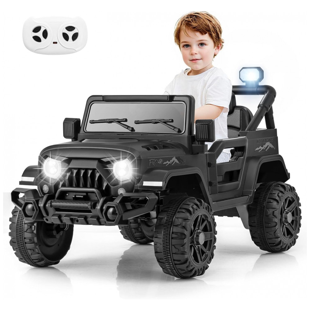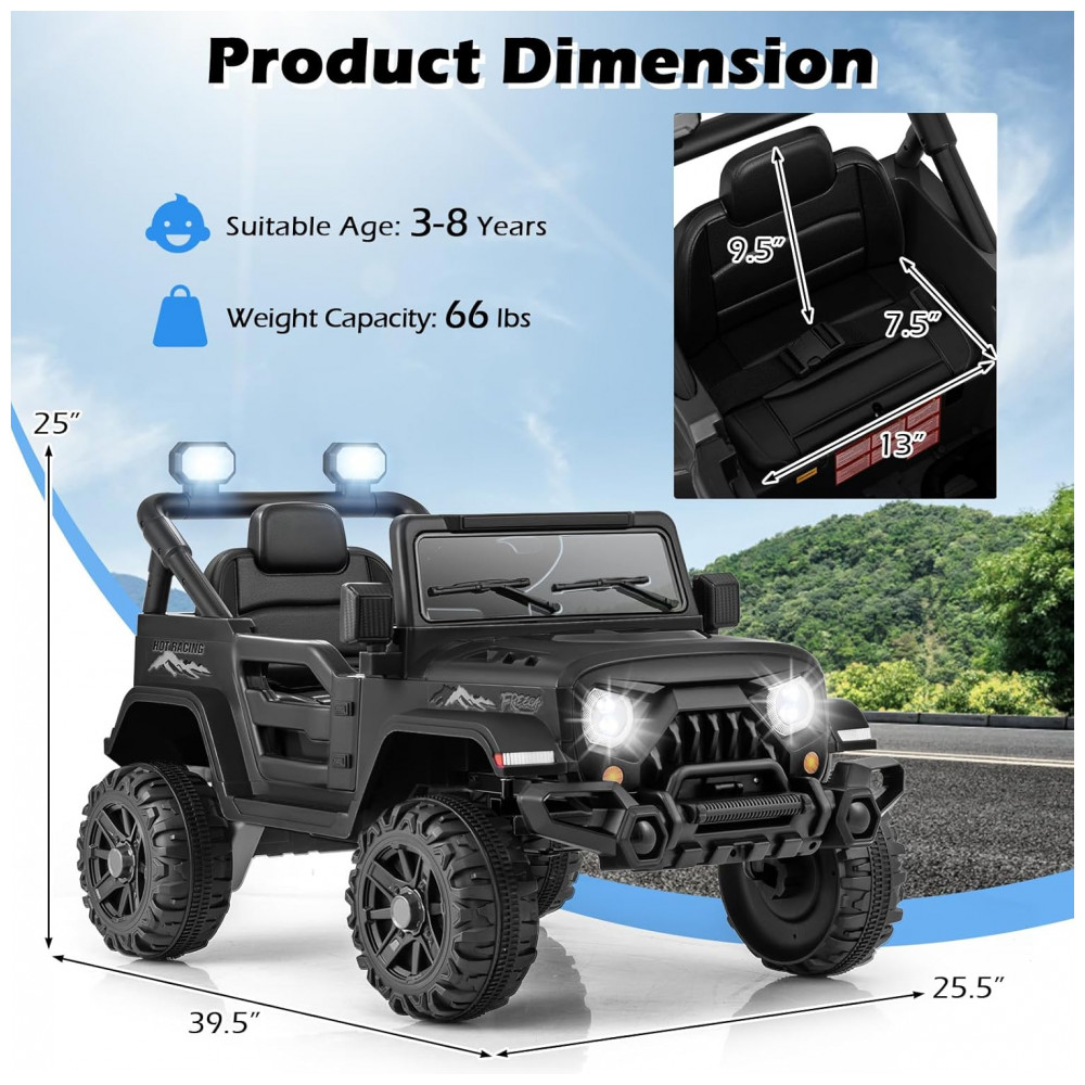 Carro Elétrico Infantil OLAKIDS Preto 12V Controle Remoto Jeep LED Bluetooth 2 Velocidades Suspensão Música USB MP3 3-8 Anos