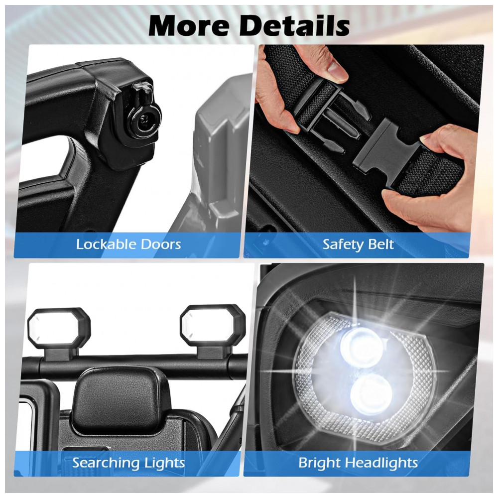 Recursos de segurança: Cinto de 2 pontos, portas com trava, partida suave, controle remoto parental