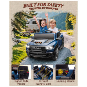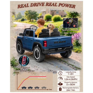 Este carro elétrico infantil RAM 1500 24V licenciado oficialmente oferece uma experiência realista com rodas robustas, câmbio manual funcional e caçamba com porta basculante, perfeito para crianças que desejam um caminhão estiloso e potente. O design reforçado inclui portas com trava, cinto de segurança e laterais altas para proteção adicional.