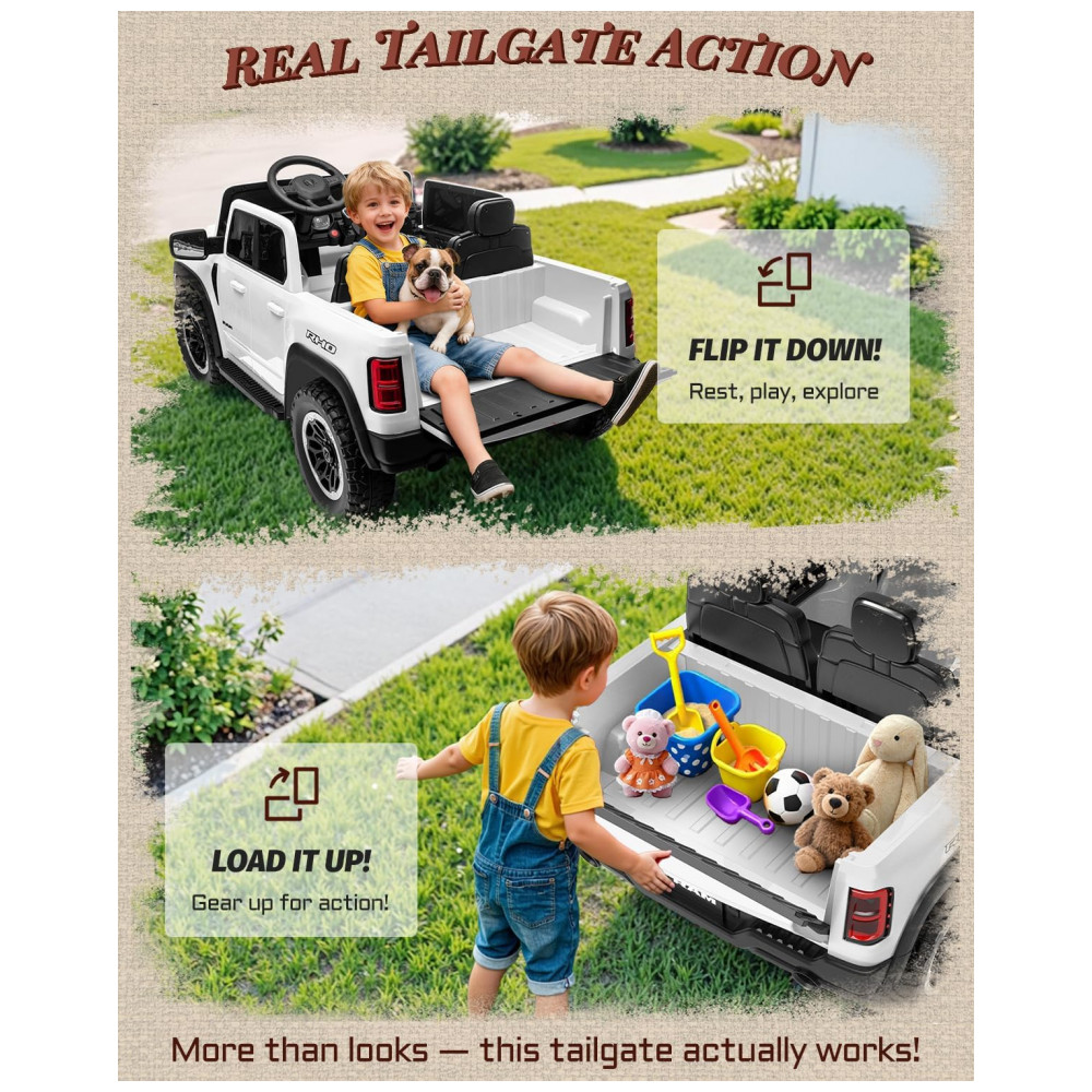 Com espaço para dois passageiros em um assento de 51 cm de largura, permite que irmãos ou amigos compartilhem a diversão, enquanto o compartimento traseiro oferece armazenamento extra para brinquedos. Equipado com Bluetooth, sons de motor, faróis e buzina funcionais, a brincadeira fica completa.