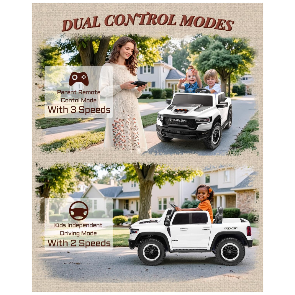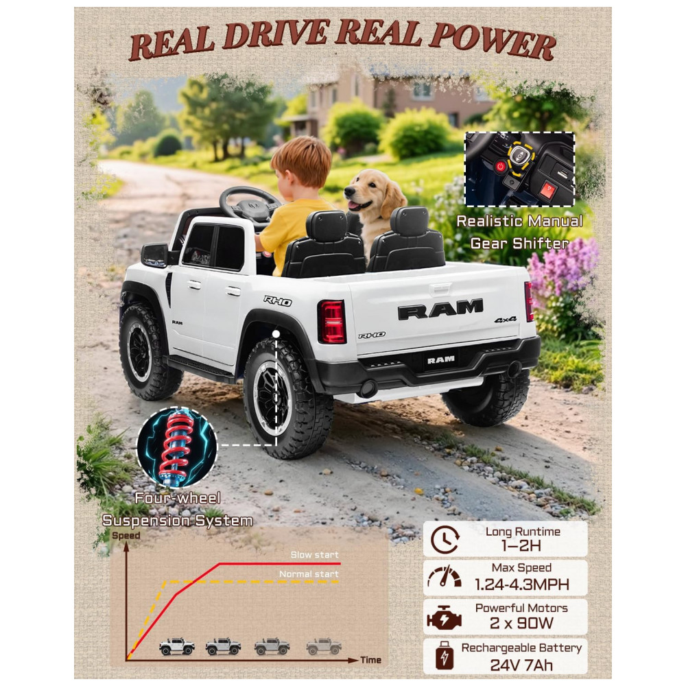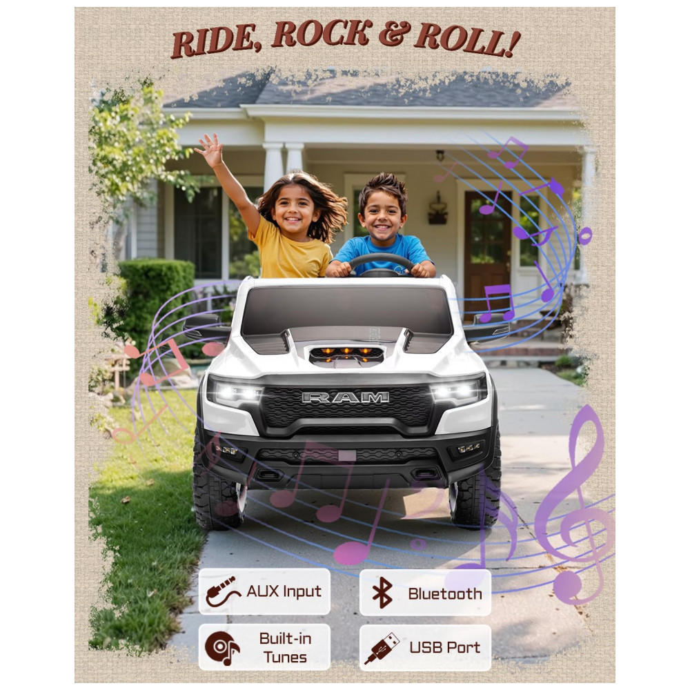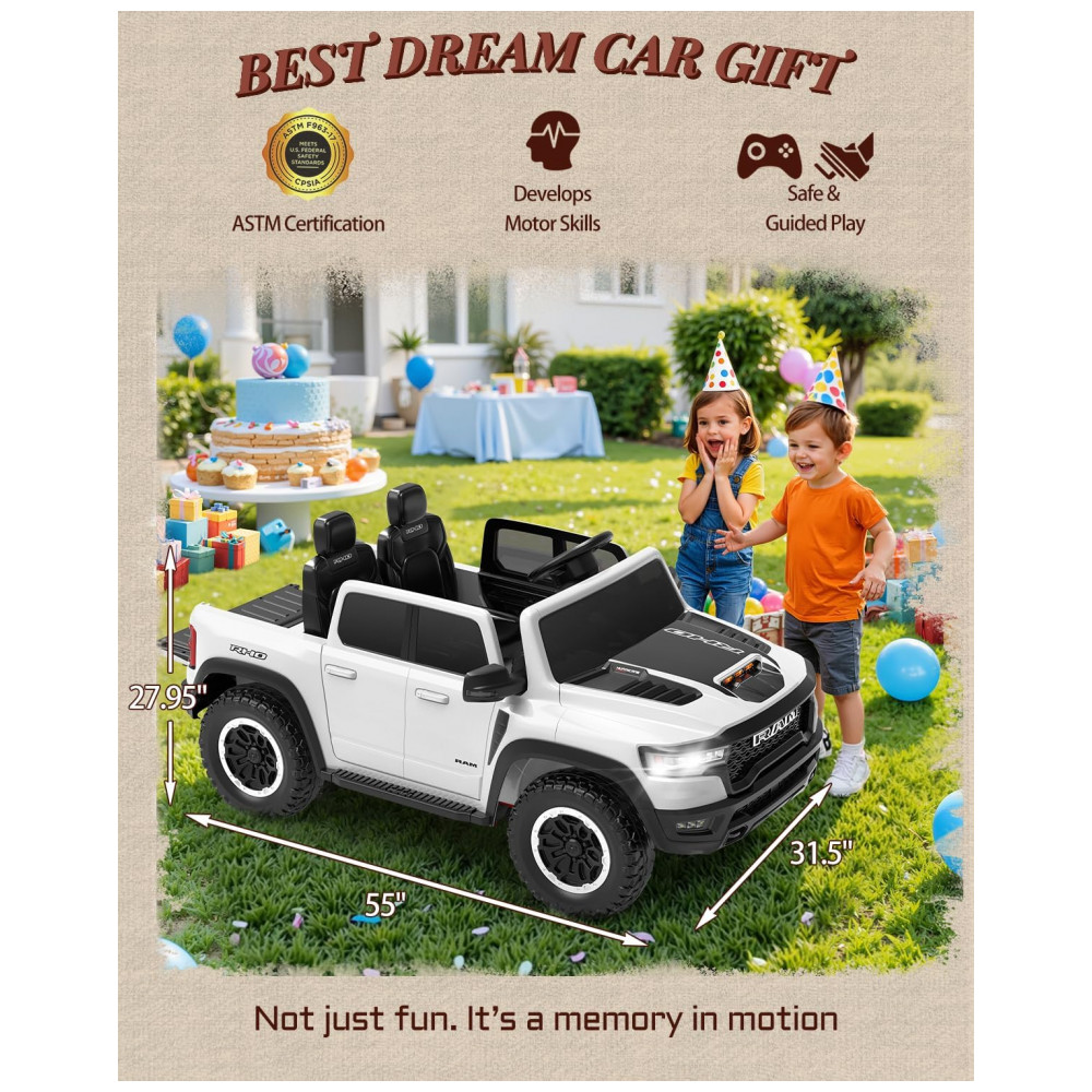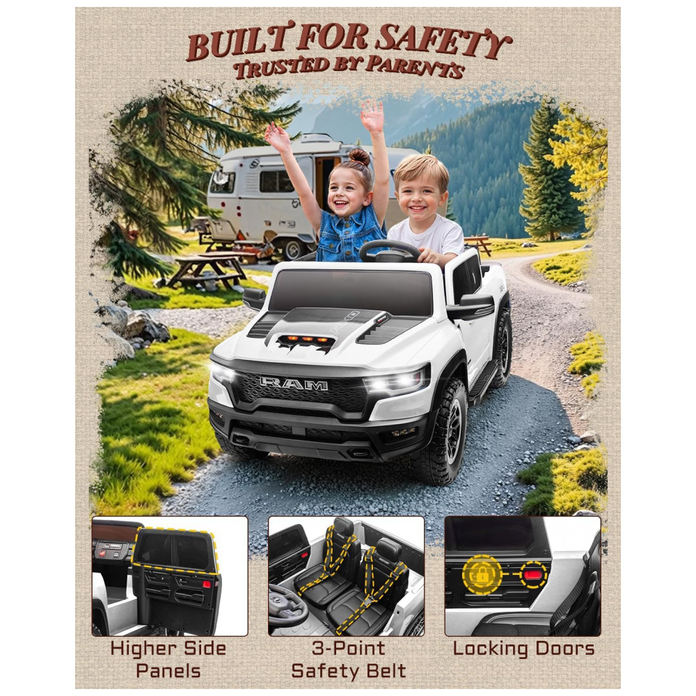 Carro Elétrico Infantil RAM 1500 24V Branco 2 Lugares com Controle Remoto Bluetooth Luzes LED Baú e Cinto de Segurança