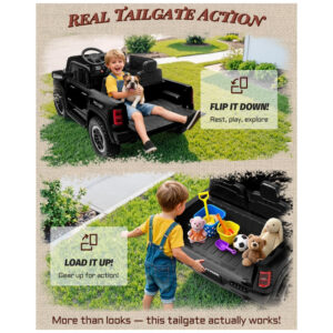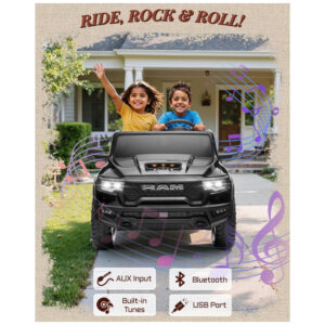 Com espaço para dois passageiros em um assento de 51 cm de largura, permite que irmãos ou amigos compartilhem a diversão, enquanto o compartimento traseiro oferece armazenamento extra para brinquedos. Equipado com Bluetooth, sons de motor, faróis e buzina funcionais, a brincadeira fica completa.