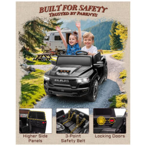 Este carro elétrico infantil RAM 1500 24V licenciado oficialmente oferece uma experiência realista com rodas robustas, câmbio manual funcional e caçamba com porta basculante, perfeito para crianças que desejam um caminhão estiloso e potente. O design reforçado inclui portas com trava, cinto de segurança e laterais altas para proteção adicional.