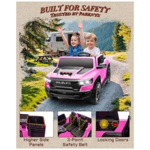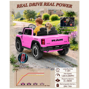 Este carro elétrico infantil RAM 1500 24V licenciado oficialmente oferece uma experiência realista com rodas robustas, câmbio manual funcional e caçamba com porta basculante, perfeito para crianças que desejam um caminhão estiloso e potente. O design reforçado inclui portas com trava, cinto de segurança e laterais altas para proteção adicional.