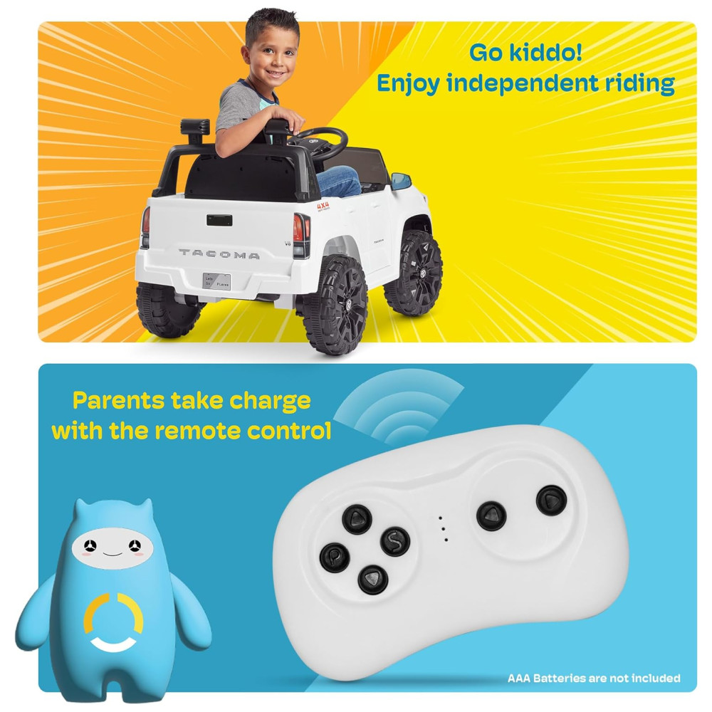 DESIGN ESTILO O carro Toyota Tacoma oficialmente licenciado se parece com o caminhão real. Também está muito próximo da experiência completa com luzes LED, sons de inicialização, 4 rodas resistentes ao desgaste, espaço de zenamento, MP3 player, entrada AUX e porta para pen drive. Este passeio também pode ser conectado ao seu dispositivo inteligente para reproduzir música ou uma variedade de arquivos de áudio. Existem também portas que abrem e fecham totalmente para proporcionar uma experiência de condução autêntica que as crianças vão adorar.