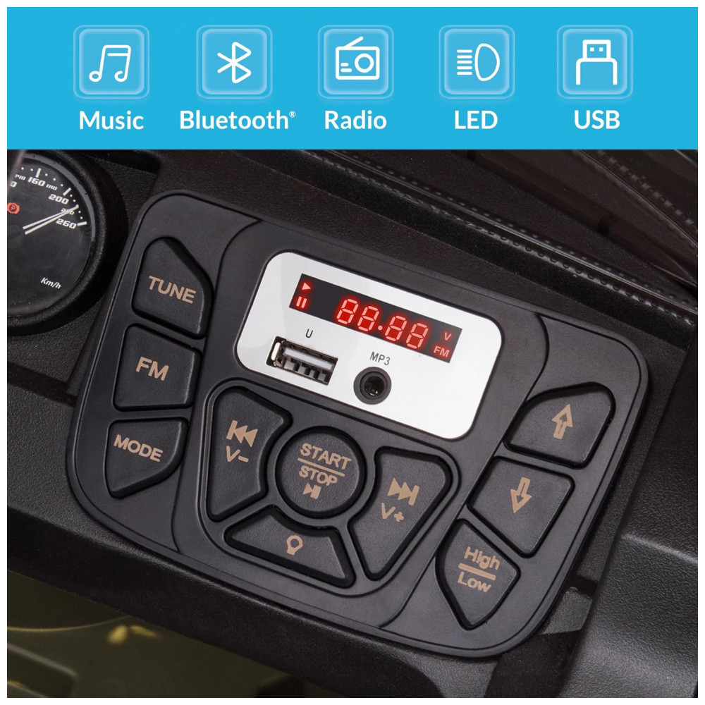 2 MODOS DE CONDUÇÃO Arranque com botão de pressão, escolha entre marcha à frente ou ré e velocidade de condução alta ou baixa. Acelere pressionando o pedal e manobre girando o volante. Deixe seu filho dirigir sozinho ou você pode controlar o veículo usando o controle remoto 2.4G para guiá lo com segurança. O controle remoto está equipado com controles de avanço, ré, estacionamento, operações de direção e seleção de 3 velocidades com faixa de velocidade de aproximadamente 2,4 a 4,2 km, h.
