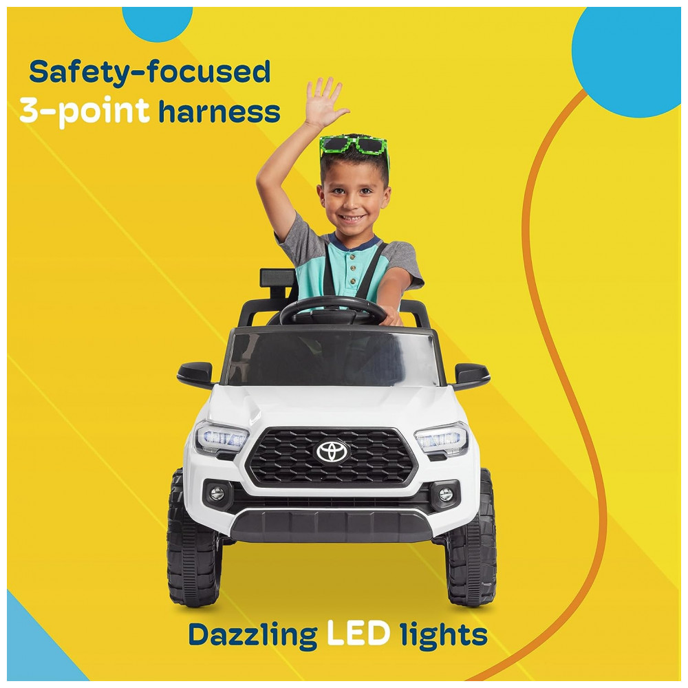 DESIGN ESTILO O carro Toyota Tacoma oficialmente licenciado se parece com o caminhão real. Também está muito próximo da experiência completa com luzes LED, sons de inicialização, 4 rodas resistentes ao desgaste, espaço de zenamento, MP3 player, entrada AUX e porta para pen drive. Este passeio também pode ser conectado ao seu dispositivo inteligente para reproduzir música ou uma variedade de arquivos de áudio. Existem também portas que abrem e fecham totalmente para proporcionar uma experiência de condução autêntica que as crianças vão adorar.