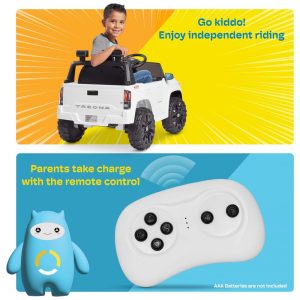 E DURÁVEL Este caminhão elétrico é feito de plástico durável e não tóxico com certificação ASTM para maior confiabilidade. A combinação de pneus de mola com amortecedor, design de partida lenta, cintos de segurança ajustáveis de três pontos e portas com trava oferecem melhor proteção para seus filhos.