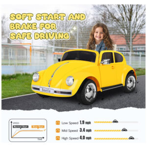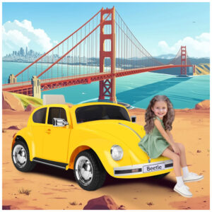 Carro Elétrico Infantil Volkswagen Beetle Forever Source Amarelo 12V Controle Remoto LED 3 Velocidades Música e autonomia de 60-90min