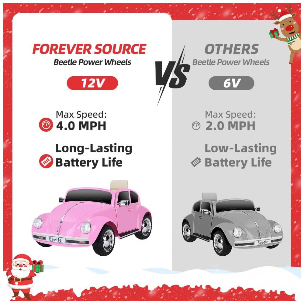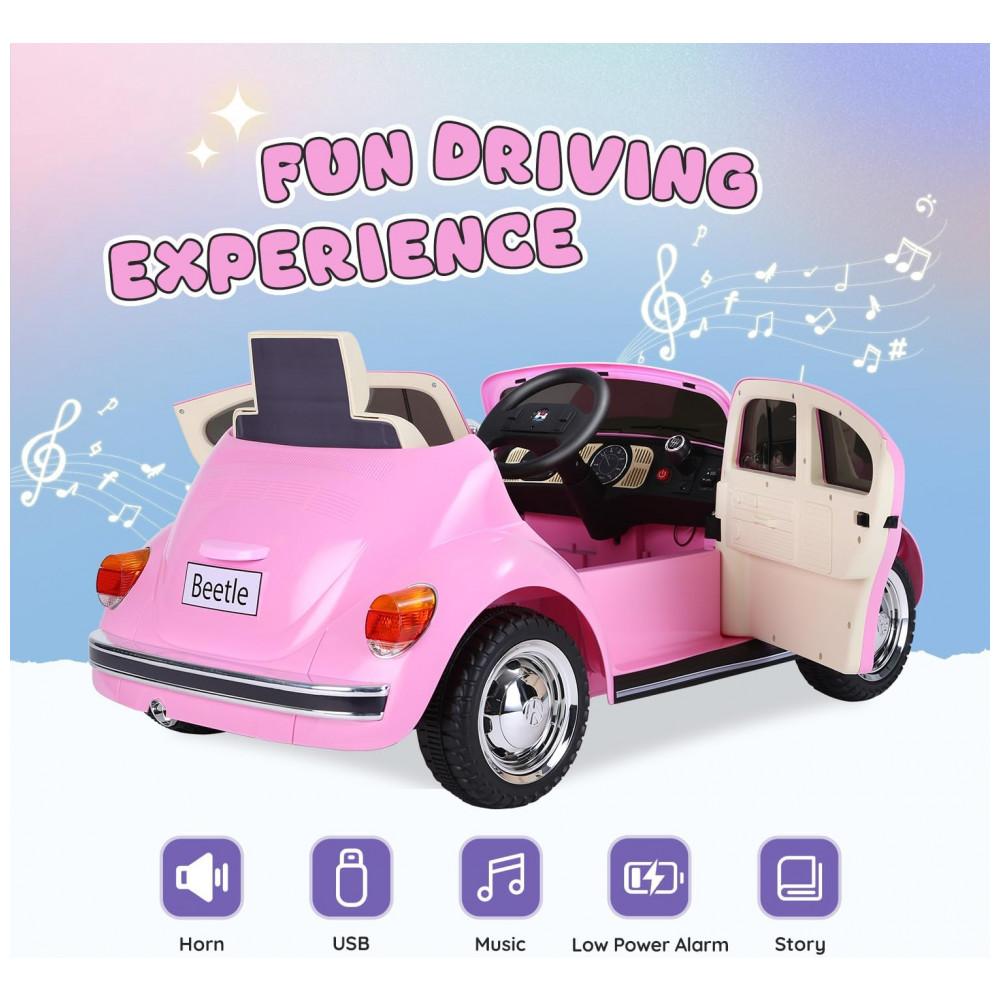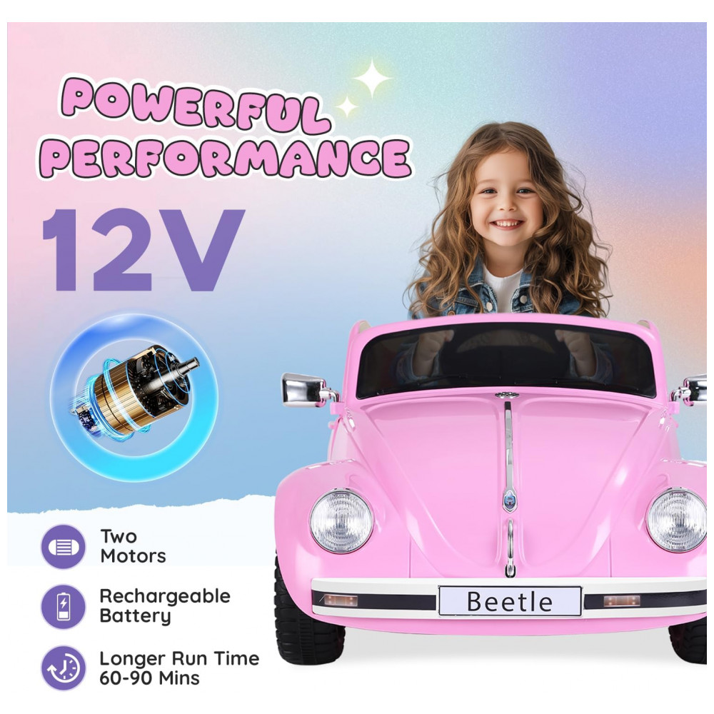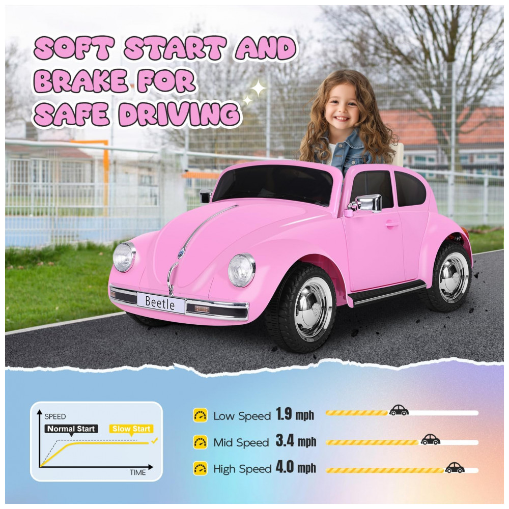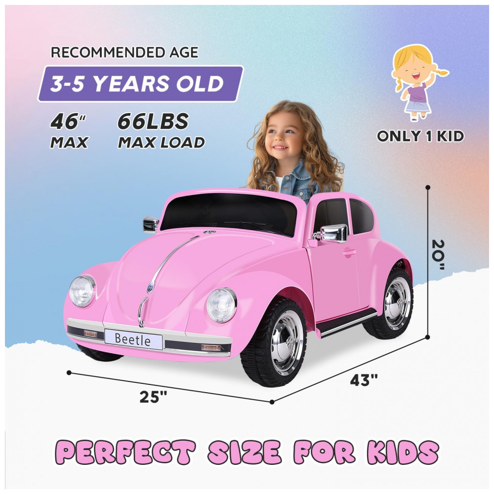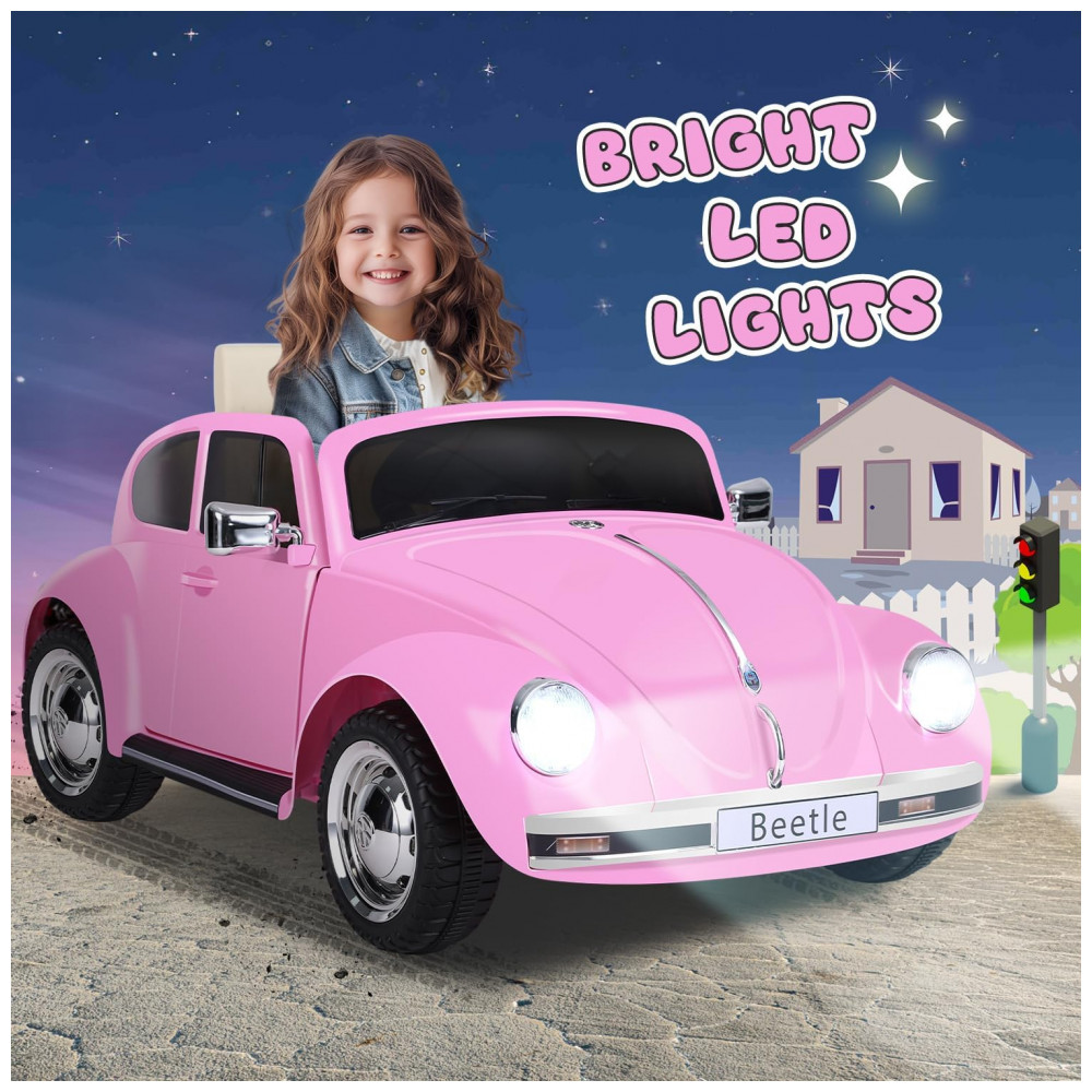 Carro Elétrico Infantil Volkswagen Beetle Forever Source Rosa 12V Controle Remoto LED 3 Velocidades Música e autonomia de 60-90min